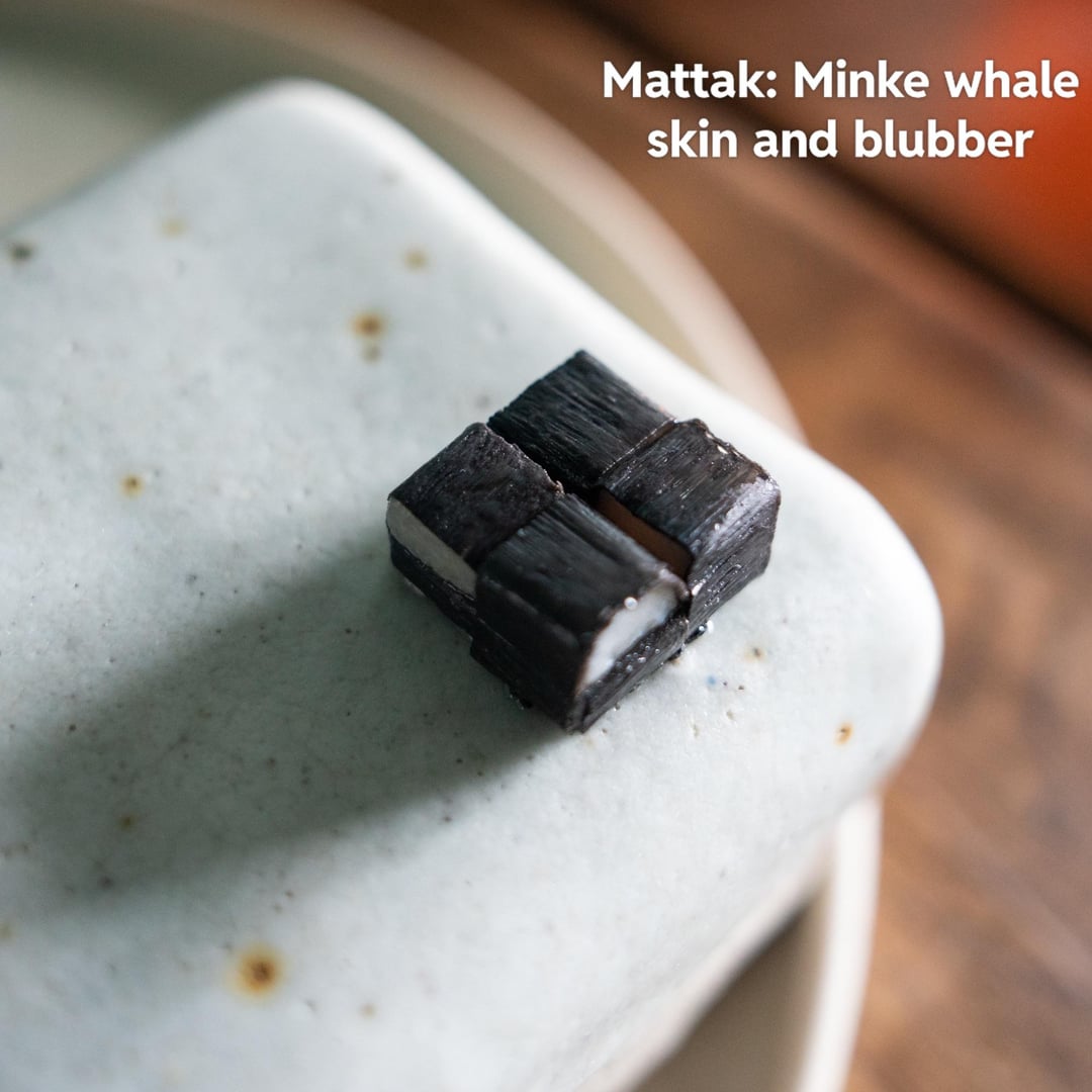 – Mattak: (minke whale skin and blubber): Traditionally, Greenlandic people eat raw cubes of whale (can be minke, narwhal, or others) skin and blubber with the layer of ligaments in between. This middle layer is chewy like gum, you just have to swallow it. At Koks, the gummy middle layer is removed and cooked into a glaze with sugar kelp and soy, and then this glaze is placed back on the cube of skin and blubber. The taste was nutty, fatty, and fishy, and it was balanced by an accompanying fresh salad grown in a greenhouse.