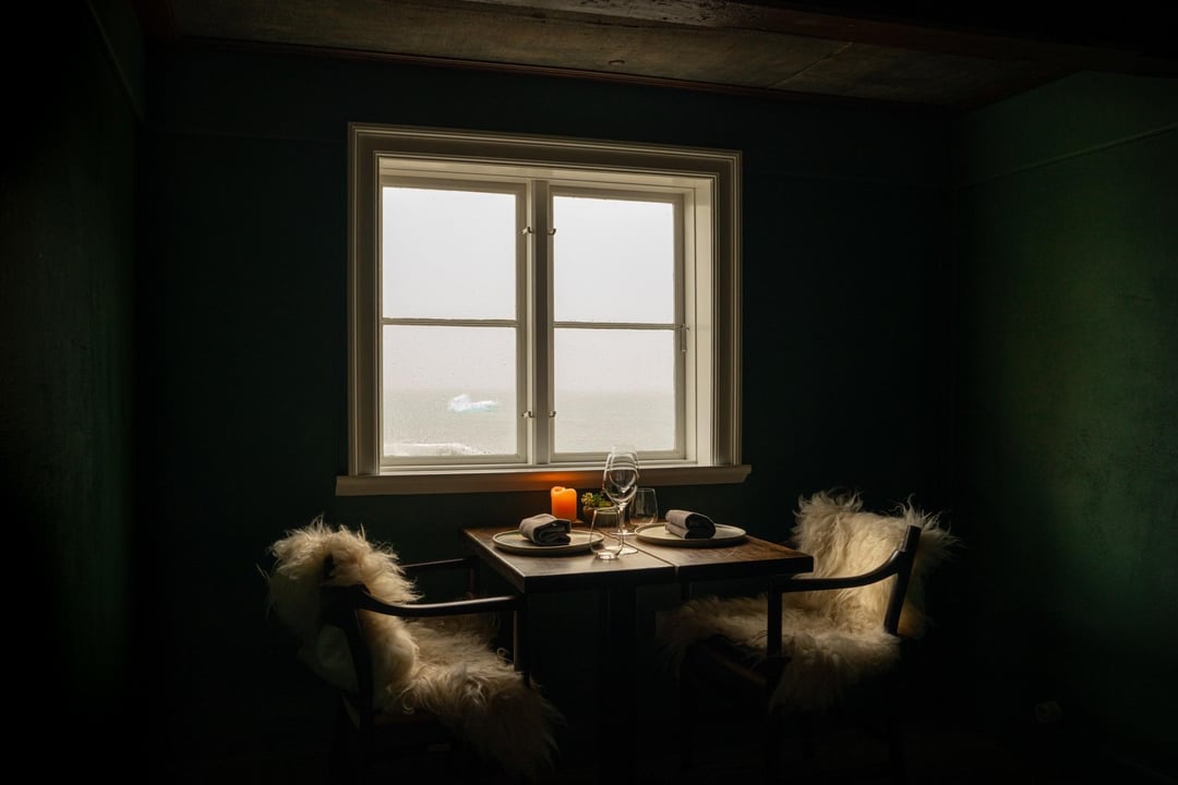 At 6:30PM, dressed in my finest winter hiking clothes and muddy hiking boots, I walked the short distance from my bungalow to the restaurant. It was raining. The hostess took my Arcteryx rain shell as if it was Max Mara and this was a fine dining restaurant in Manhattan, and I gladly changed into the comfy sealskin slippers provided by the restaurant. At my table, sitting in a sheepskin covered chair, I could see the icebergs outside. Oftentimes, if you are lucky, you might even see whales in the bay.