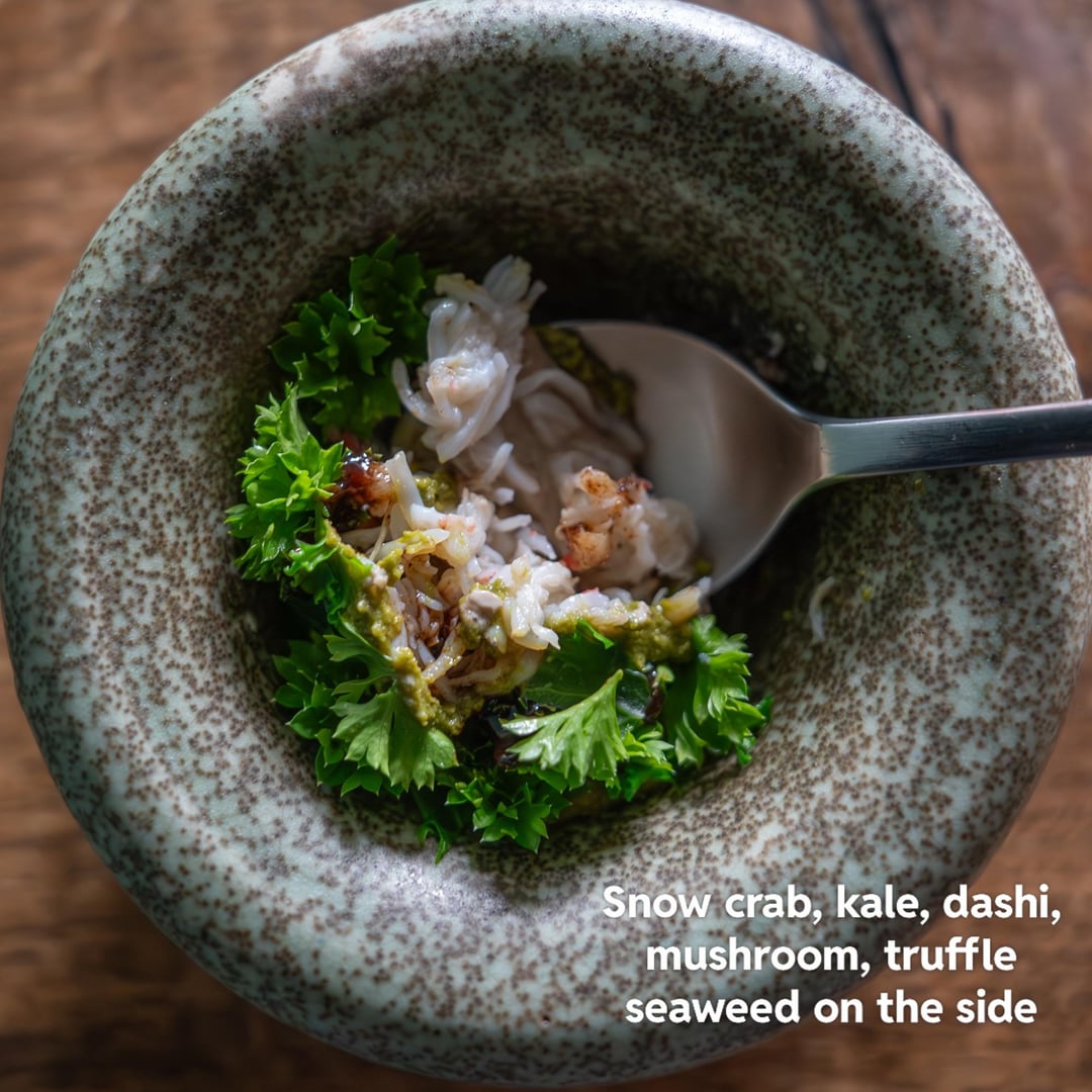 – Snow crab, kale, dashi, mushroom, with truffle seaweed on the side: the crab was made into an umami bomb, and the fragrant seaweed smelled and tasted like the earth and the sea at the same time, think of truffles but briny.