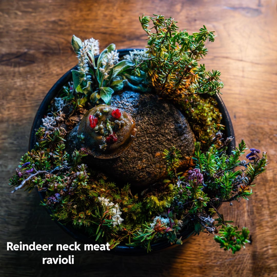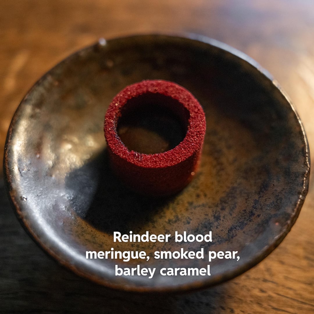 – Reindeer blood meringue with smoked pear and barley caramel: Arctic desserts are metal.