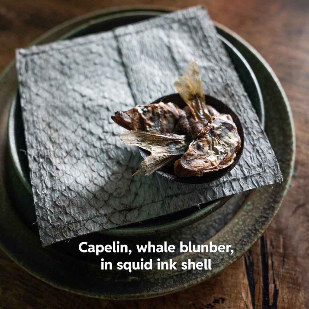 – Capelin with Arctic roseroot and whale blubber in squid ink shell: Cwispy. Hyperseasonal fish, only available for 3 weeks in July every year.