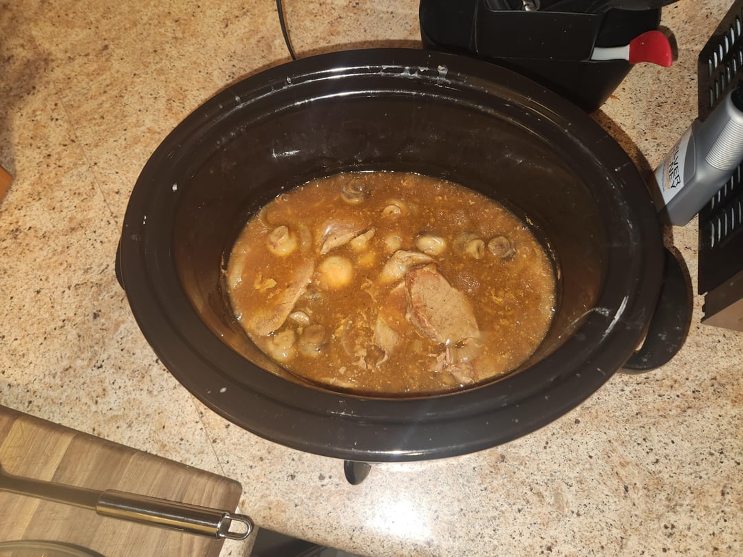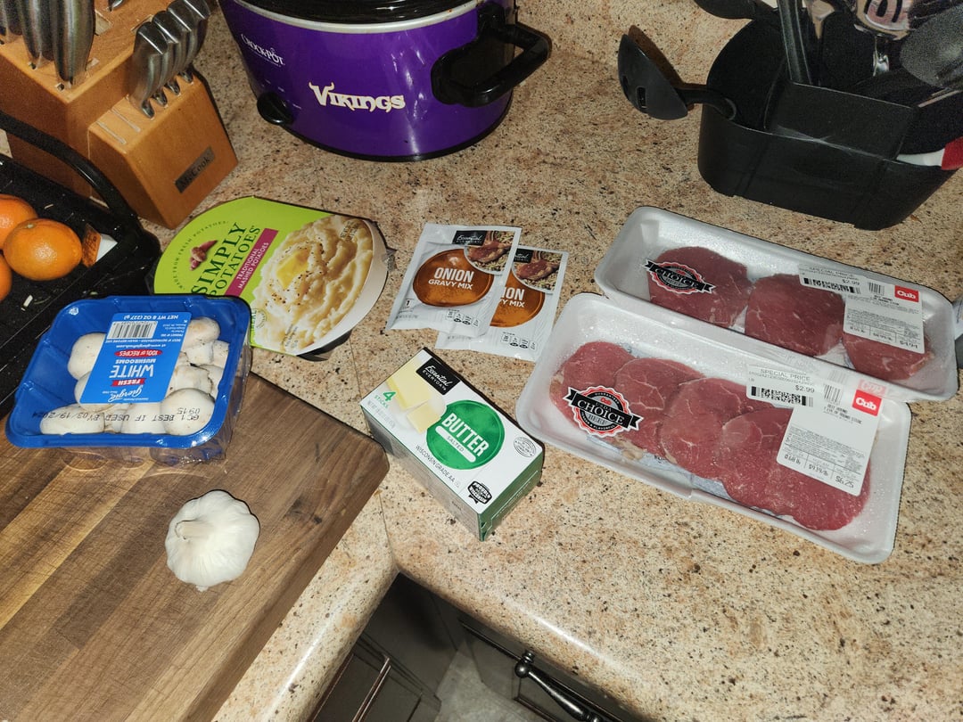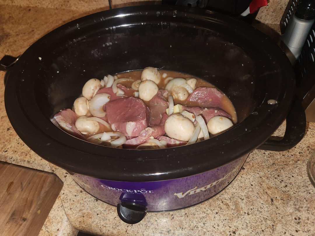 Beef round steak was on sale at local grocery. Googled round steak recipes and they recommend slow cooking! I pretty much followed another recipe except I strayed by using mushrooms and I used less garlic. The recipe was:
