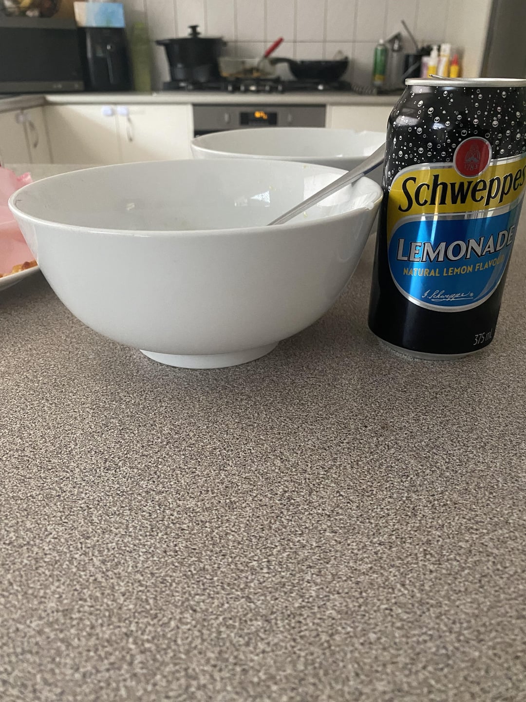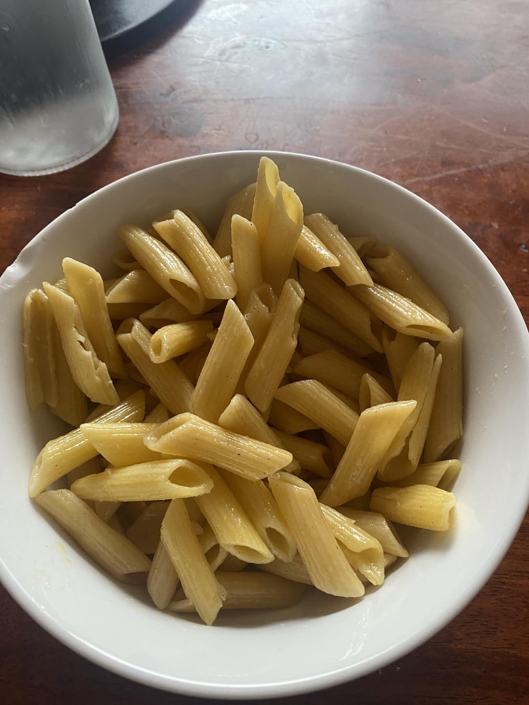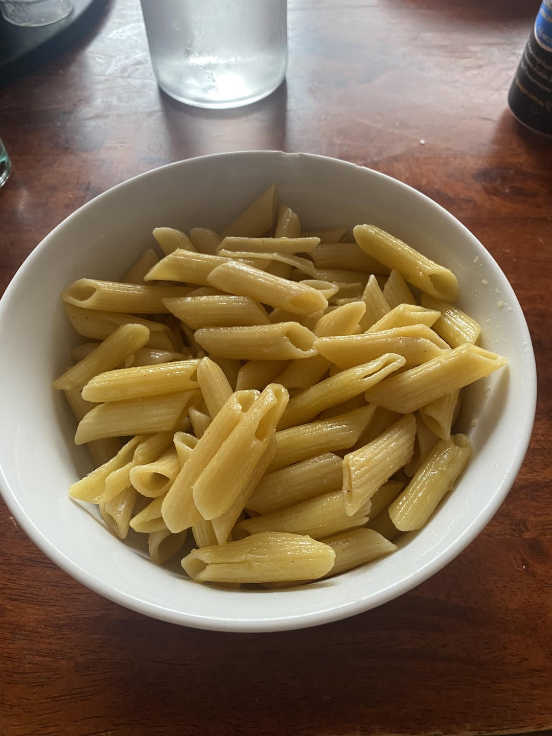 the bowl is quite large. the can is for size comparison. it is plain penne pasta with maybe a teaspoon or two of butter and salt with pepperby starwl Write A CommentYou must be logged in to post a comment.