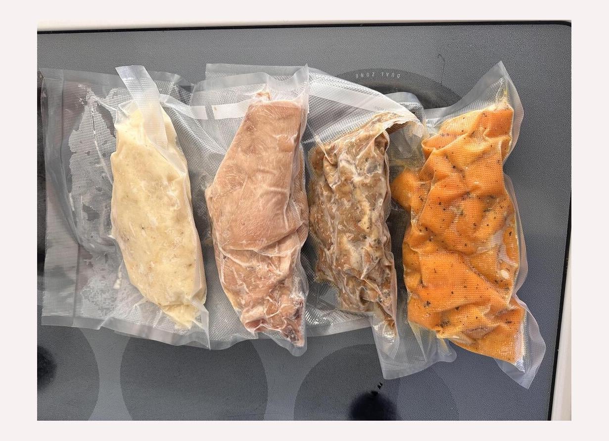 Tip: when you vacuum seal individual portions, you want the contents to be spread out in the bag / thin. It stores better and it reheats much faster, like in 15 mins.