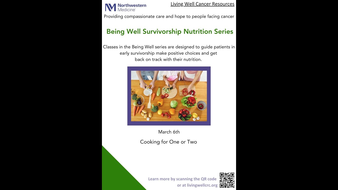 Our topic today is cooking for one or two um which is week five of the being well series here at Living Well um we have this series is for um nutrition during survivorship which is anytime after diagnosis and if you um take like week five and week six this time you can