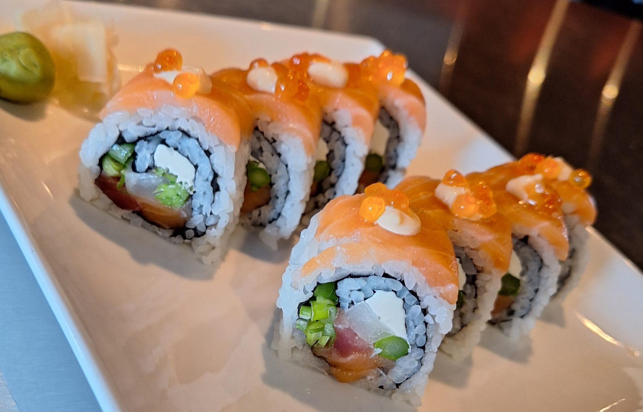 Tuna, salmon, scallion, pickled daikon radish and cream cheese.. topped with salmon, dot of spicy mayo and salmon roe.