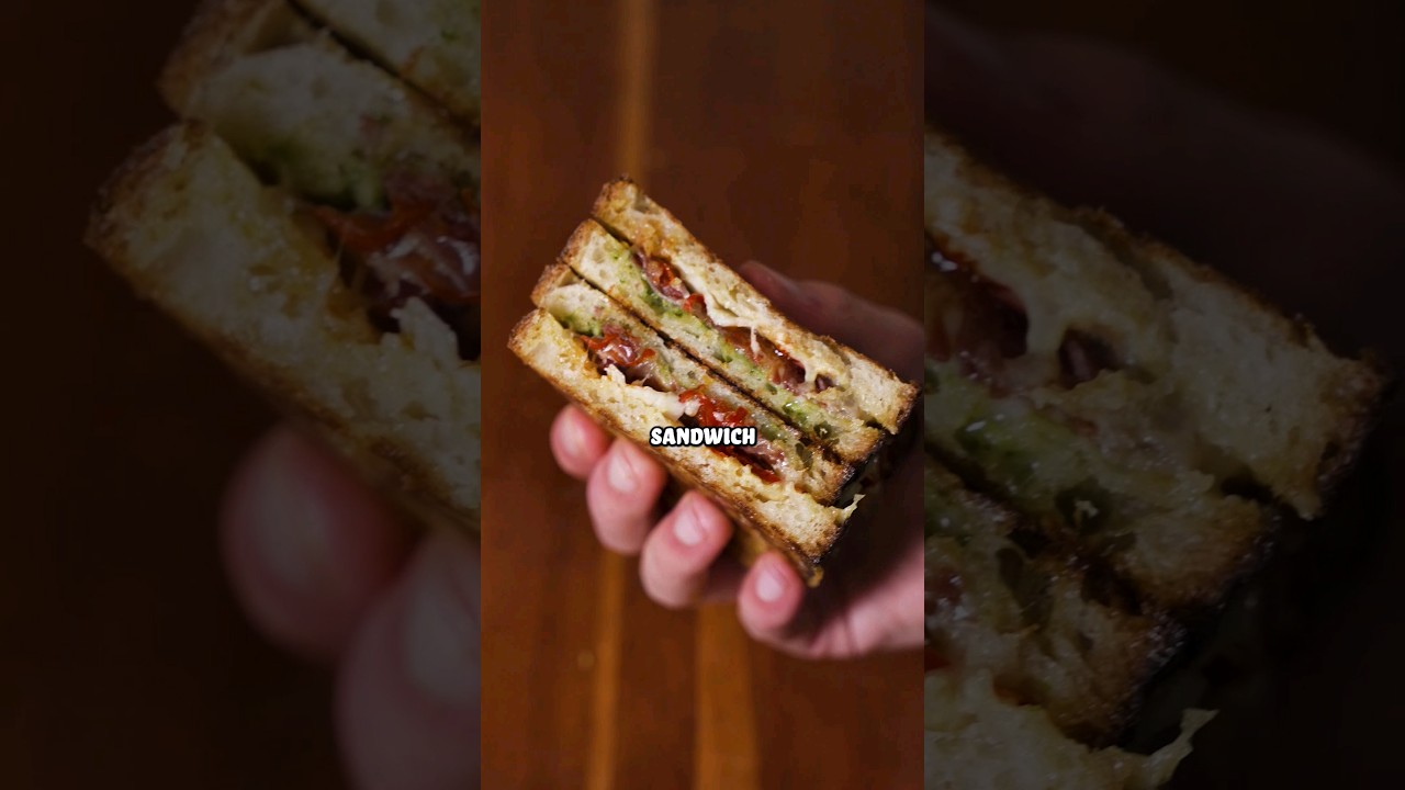 I’m hiding from hack POA for my final sandwich in the US and one last Act of defiance against hack POA I made a homemade basil pesto Dijon mustard anchovie calabrian chili and ham grilled cheese sandwich