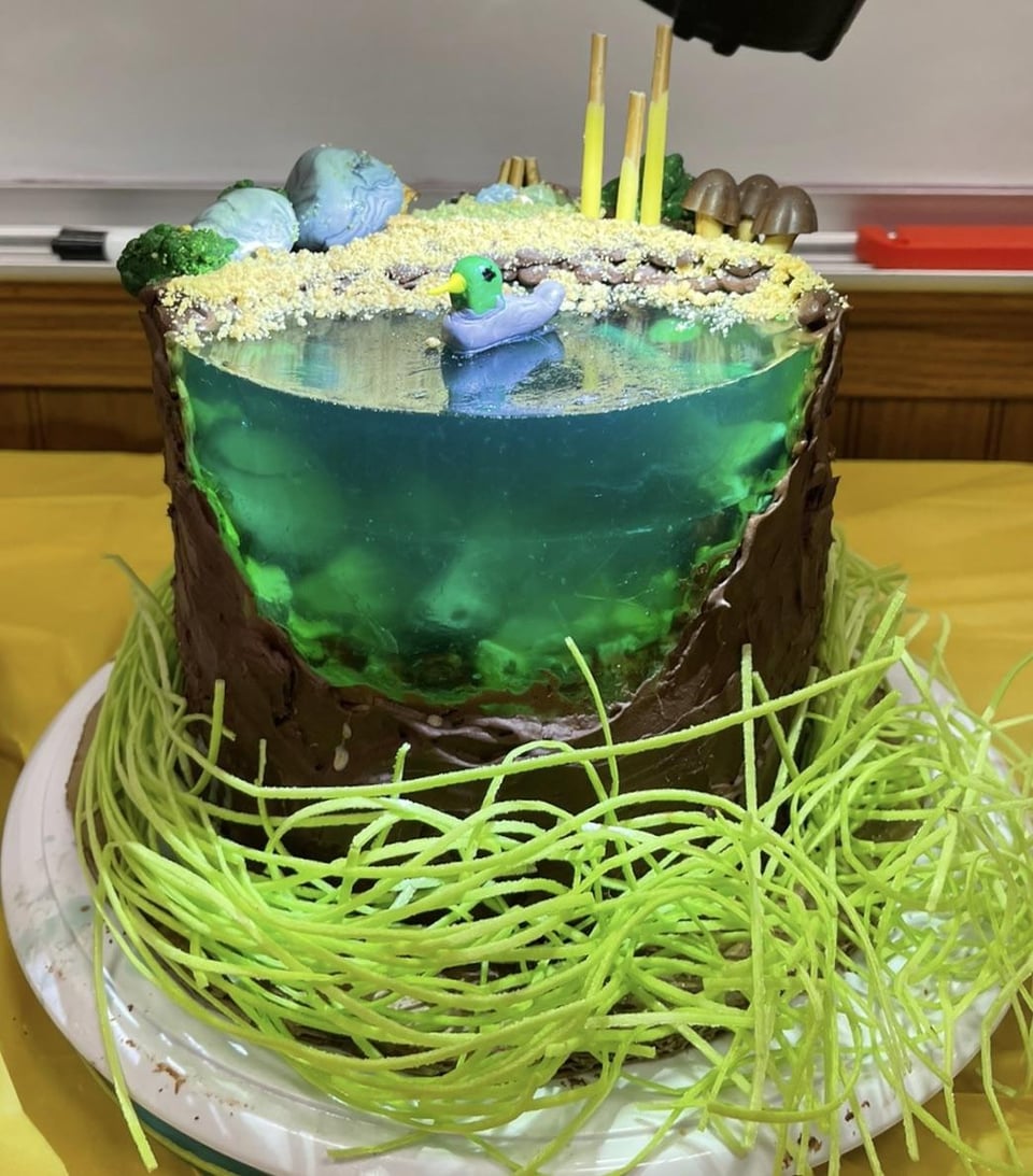 Since you all liked my son’s Zelda cake, here’s his award winning pond cake he made last year for Cub Scouts. I can’t believe we got the jello to work and stay put.