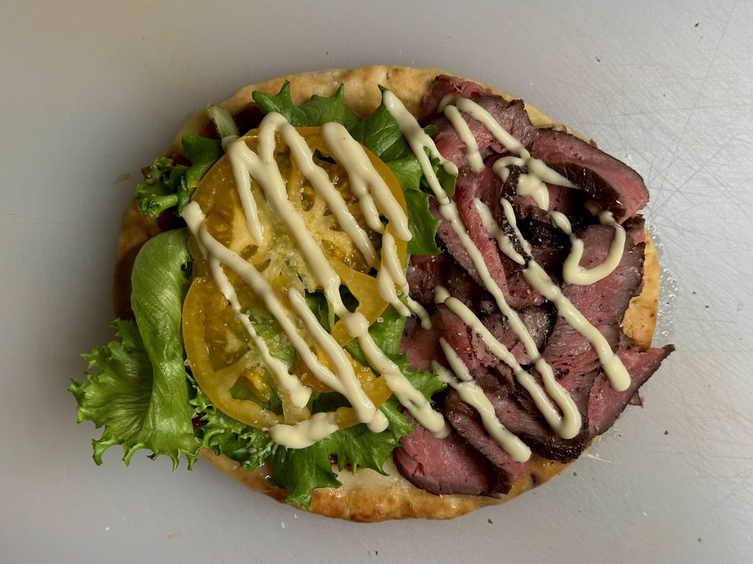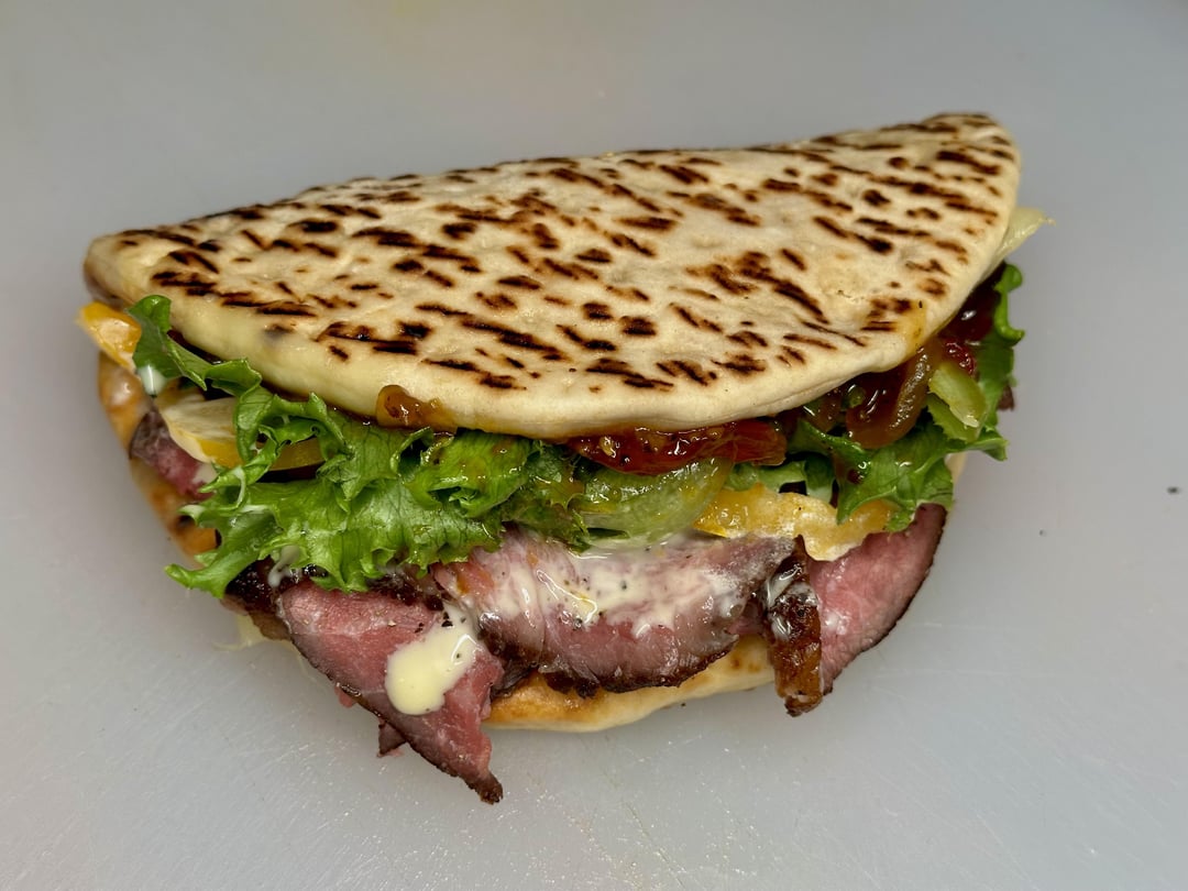 Thin sliced medium rare Ribeye loin steak piled on a thick and fluffy pocketless Greek pita, with melted Asiago cheese, lettuce, tomato, homemade sweet chili tomato onion jam, and maple mustard aioli. by No_Pattern3088 1 Comment SalomeBlackheart 2 years ago Damn, looks delicious.Write A CommentYou must be logged in to post a comment.