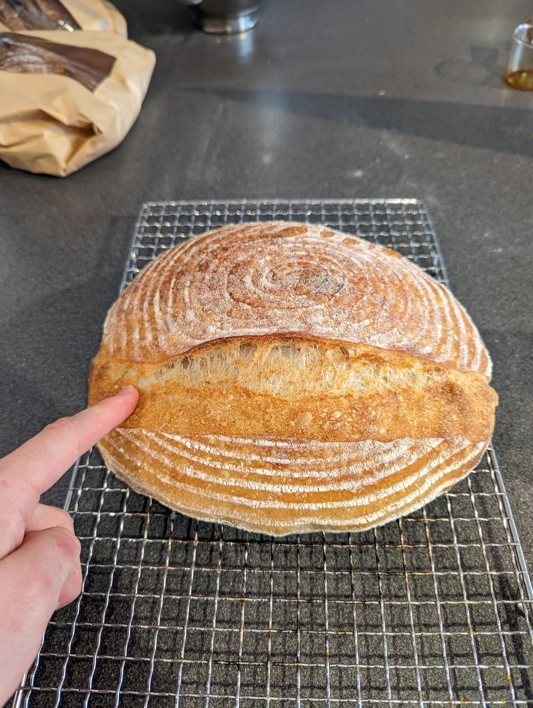 You can kind of see in the pic where the loaf has sagged back down when trying to rise because it spread so badly. Crumb looks surprisingly decent though…
