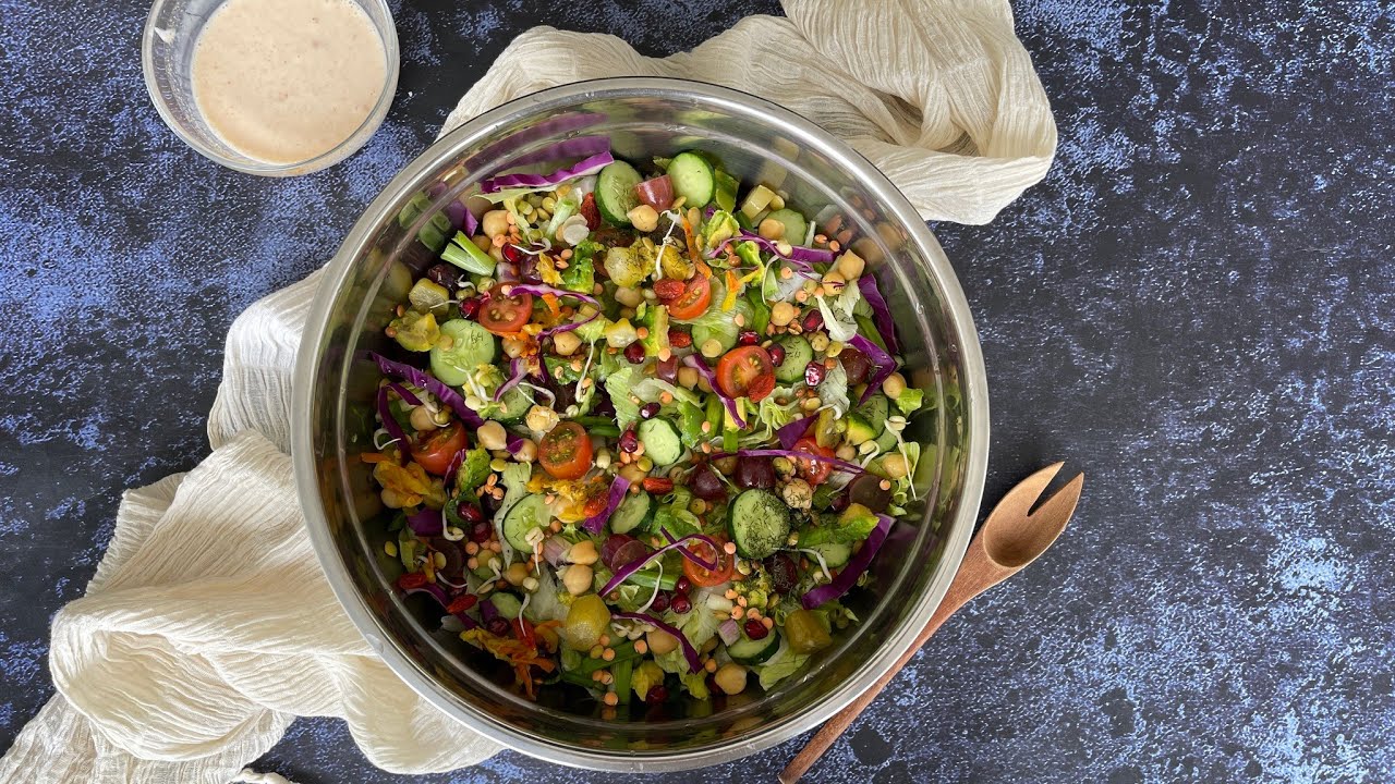 Well hello money okay hello Justice namu okay wait um this the Sal so pretty I love it okay sorry for my my big ass hands okay let’s make the dressing A dressing make dressing by combining yogurt lemon date syrup pinch of salt and pepper and mixing well okay so yogurt you