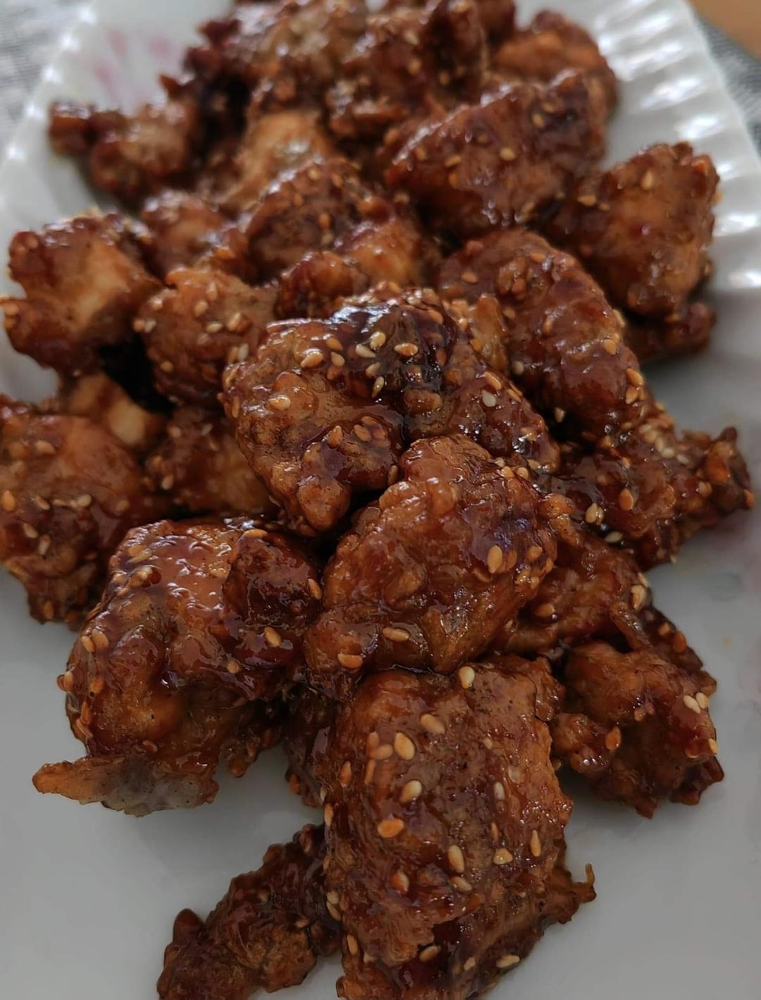 Marinate chicken breast in ground pepper, egg, and fish sauce. Coat with starch, salt, and pepper. Fry For the sauce: Mix gochujang paste, about 2-3tbsp depending on your preference, a tsp of soy sauce, and sugar. Sprikle with sesame seeds