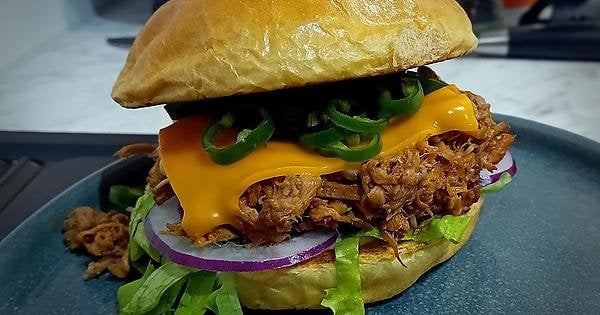 [Homemade] Pulled pork sandwich with mayo, lettuce, red onion, cheddar and pickled green chilies