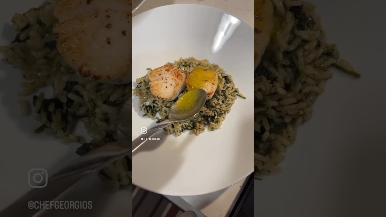 Scallops with ladolemono which is a Greek sauce lemon, olive oil, salt, pepper over Spinach and rice!