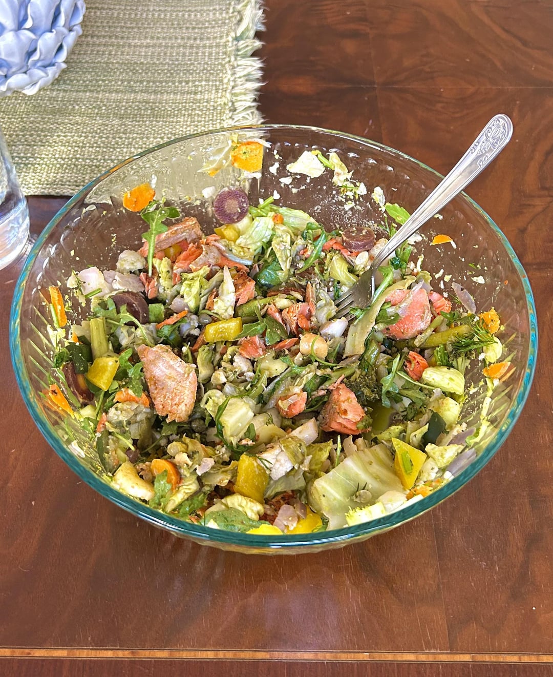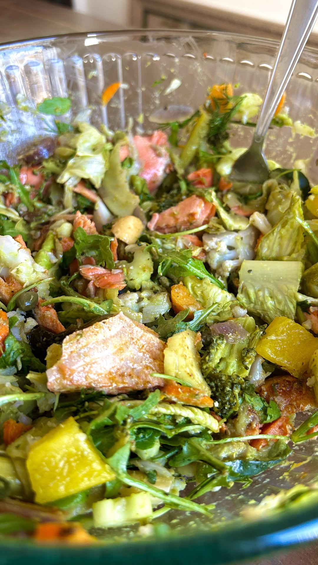I’ve been struggling with digesting sulphur-rush vegetables, lots of bloating for hours after eating, so I made a steamed and fresh vegetable salad to make it easier to digest and cuts down on chewing time significantly. It’s made a big difference. Here is the recipe:
