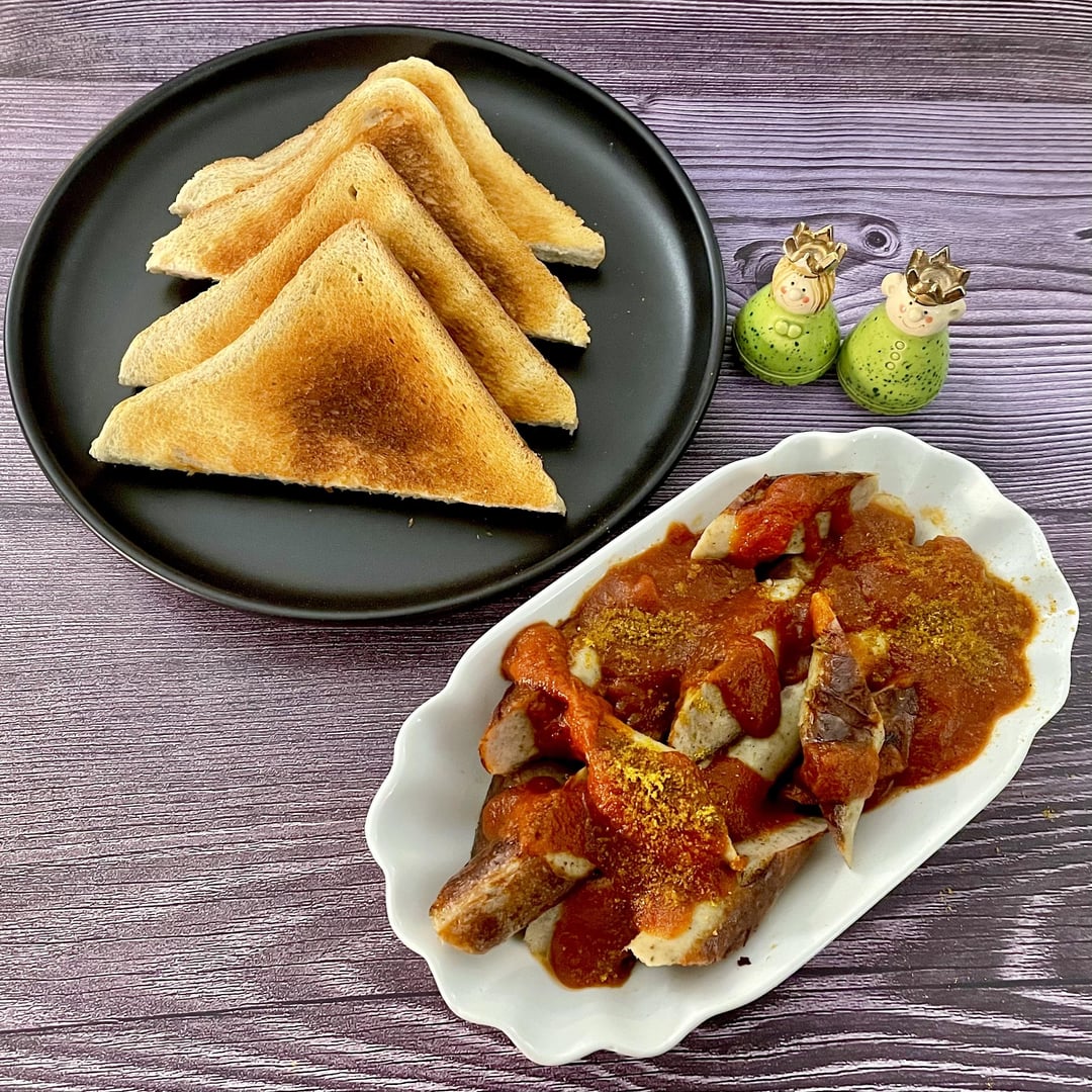 Currywurst is a steamed, fried sausage, usually pork (German: Bratwurst), typically cut into bite-sized chunks and seasoned with a curry sauce. The dish is often served with french fries or a bread roll/toasted bread.