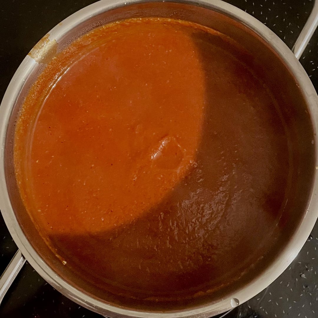 For the curry sauce you cook 500 ml of sieved tomatoes (passata), 3 tbsp of curry powder, 1 tbsp of honey, 1 tbsp of sugar, 3 tbsp of (apple cider) vinegar, 2 tbsp of instant vegetable broth, 1 tbsp of Worcestershire sauce, 1 tsp of hot paprika powder and some Tabasco to your liking.