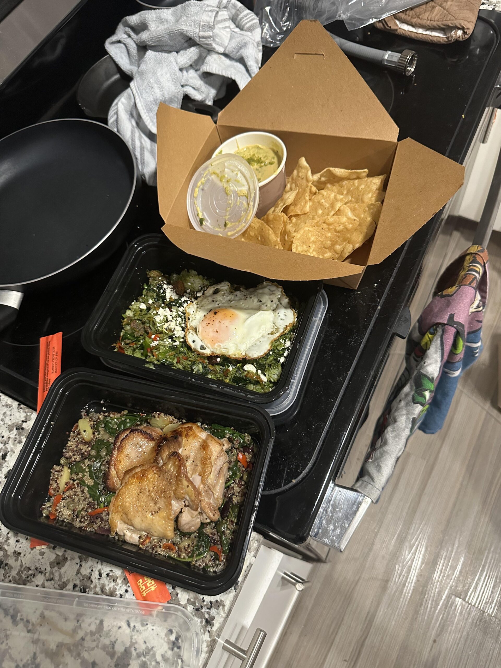 You got 3-4 oz chips plus 2oz guacamole. 1 egg, and it looks like three chicken thighs, both on a hash of quinoa, peppers, some chard? and it looks like the egg has feta or cotija cheese?