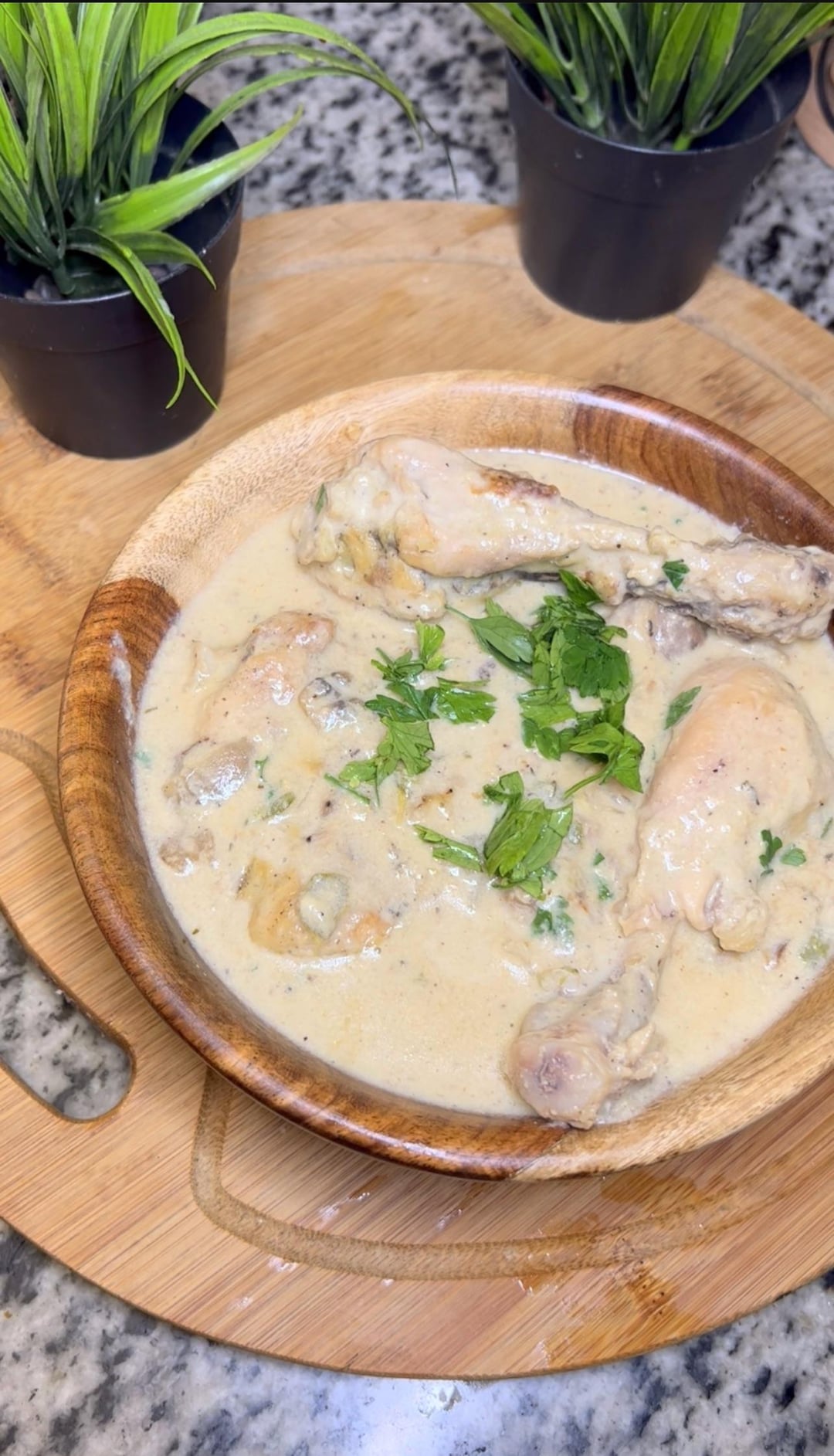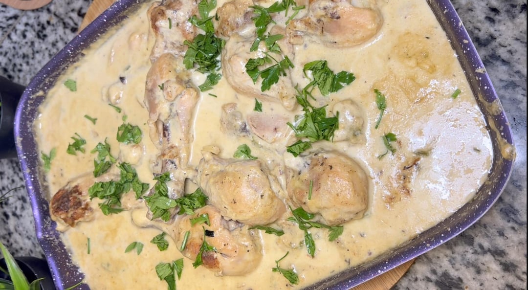 Instructions: Remove thighs skin Wash thighs Fry thighs in one olive oil spoon then leave it side In the same pan fry onion and bell pepper Add flour stir two minutes then add milk Add salt and black pepper as desired Add spices Add fried thighs Cover till cooked Garnish with parsley or as desired