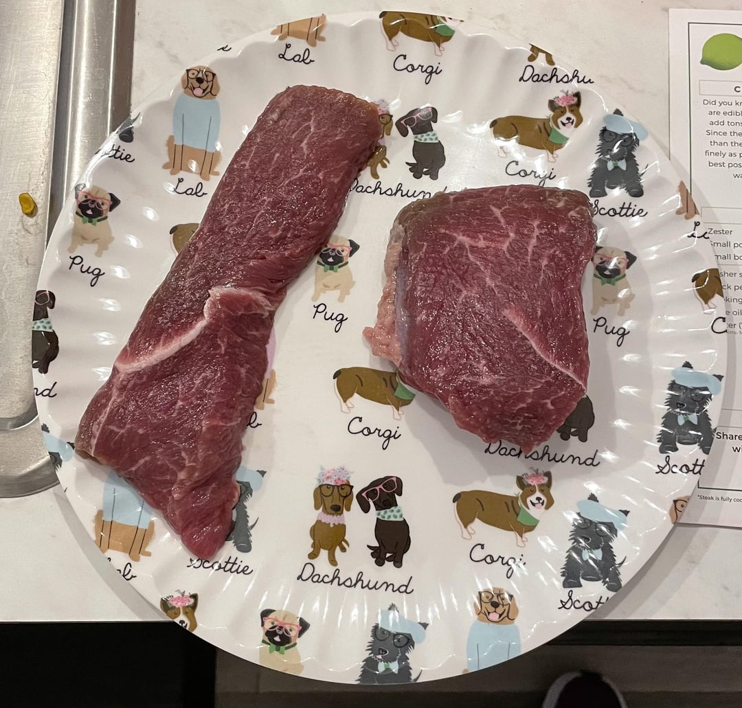 Once again, 2 extremely different cuts of steak. Annoying but not a deal breaker. The thin one cooked way too fast and was well done, which I don’t like, but that’s my fault.