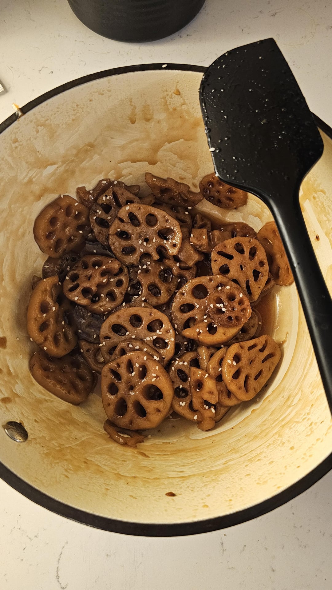 The lotus root was my absolute favorite side dish in Korea, but I guess I messed up a bit. I thought the recipe called for corn syrup, but it wanted rice syrup (which I didn't have on hand) and I may have over-reduced the sauce. It ended up being a bit too salty and didn't have a light pleasant sweet taste. I added a spoonful of honey at the end, but I think that threw it even more off. Maybe it will mellow out or transform after a few hours in the fridge. It was by and large the most intensive of the recipes taking about 2 hours after skinning, soaking, blanching, boiling, and sauteeing. Still tolerable, but not what I'd hoped for!