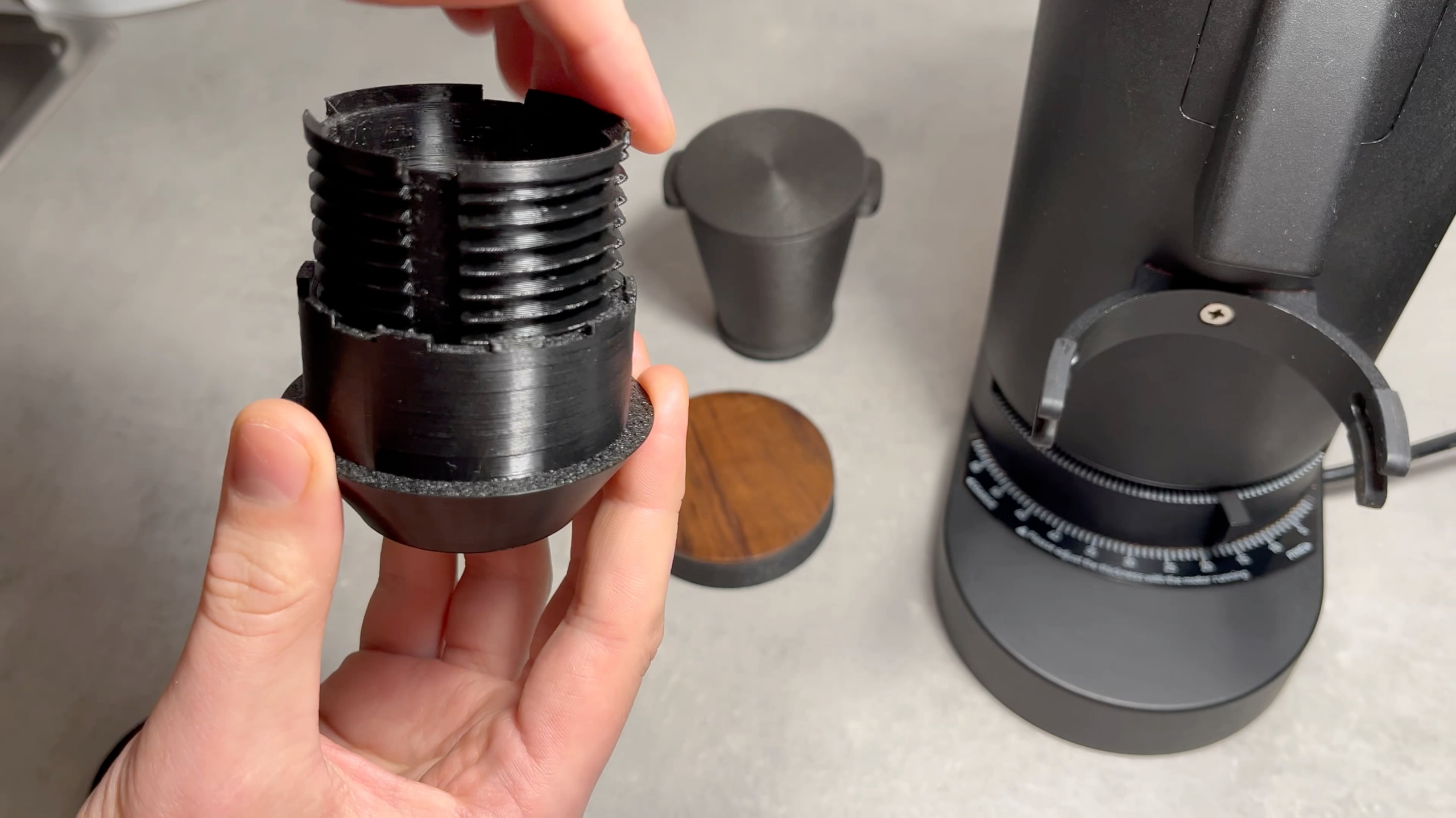 **The DF64 Gen2** version needs a little bit more time because the screw is thinner – I have to adjust some dimensions so that the smaller surface of the screw head still pushes the beans well into the opening. This requires quite a few attempts.