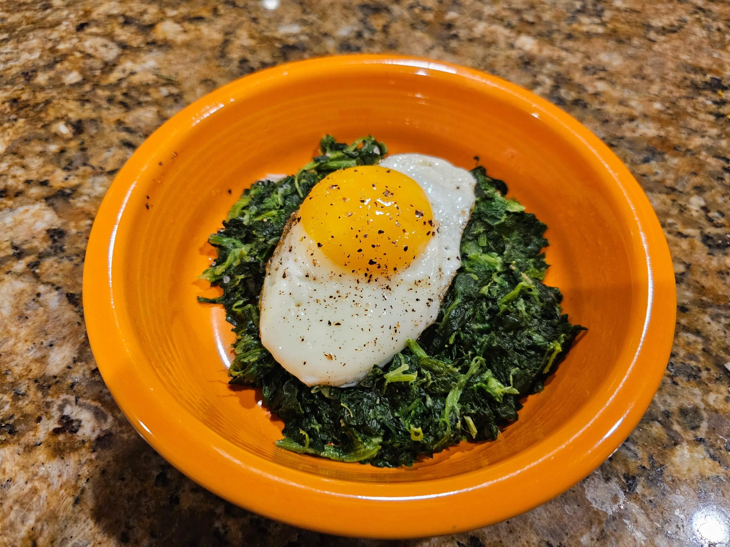 Sauteed spinach topped with an egg and lots of pepper. by TheLadyEve Write A CommentYou must be logged in to post a comment.