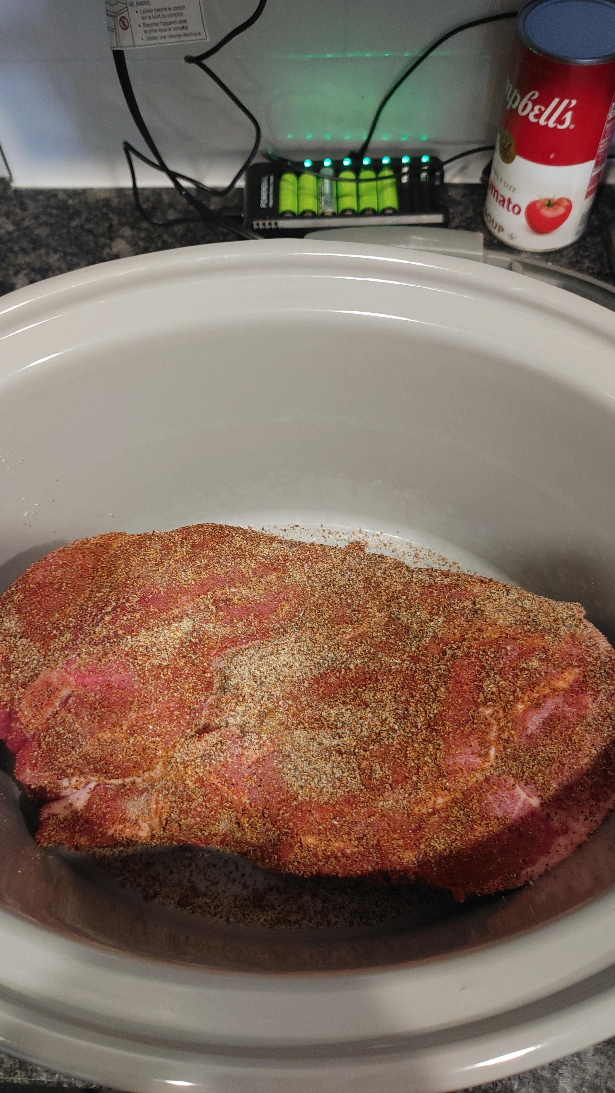 Went shopping a little late and got a 4.5 lb bone in pork shoulder. Recipe says 8-10 hours on low, possibly longer since it's bone in. I didn't put it in until 12:45 pm. I'm not trying to eat at midnight.