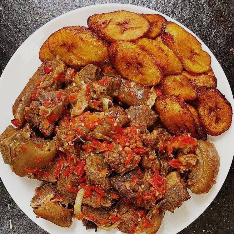 Fried plantain and goat meat with grinded red peppers – Accra, Ghana