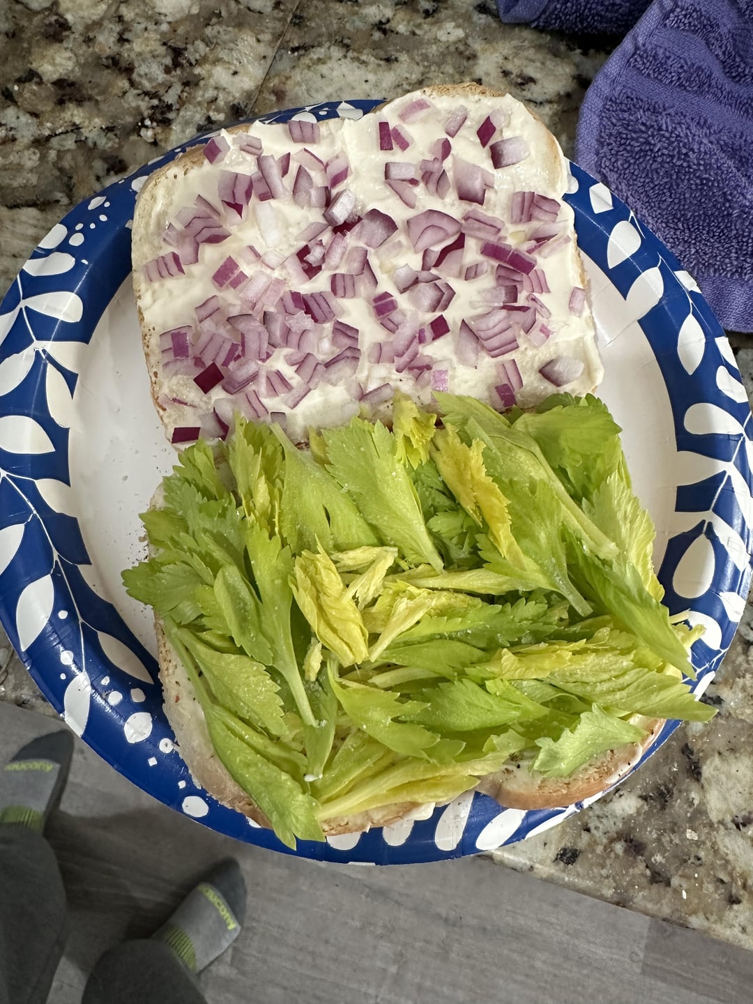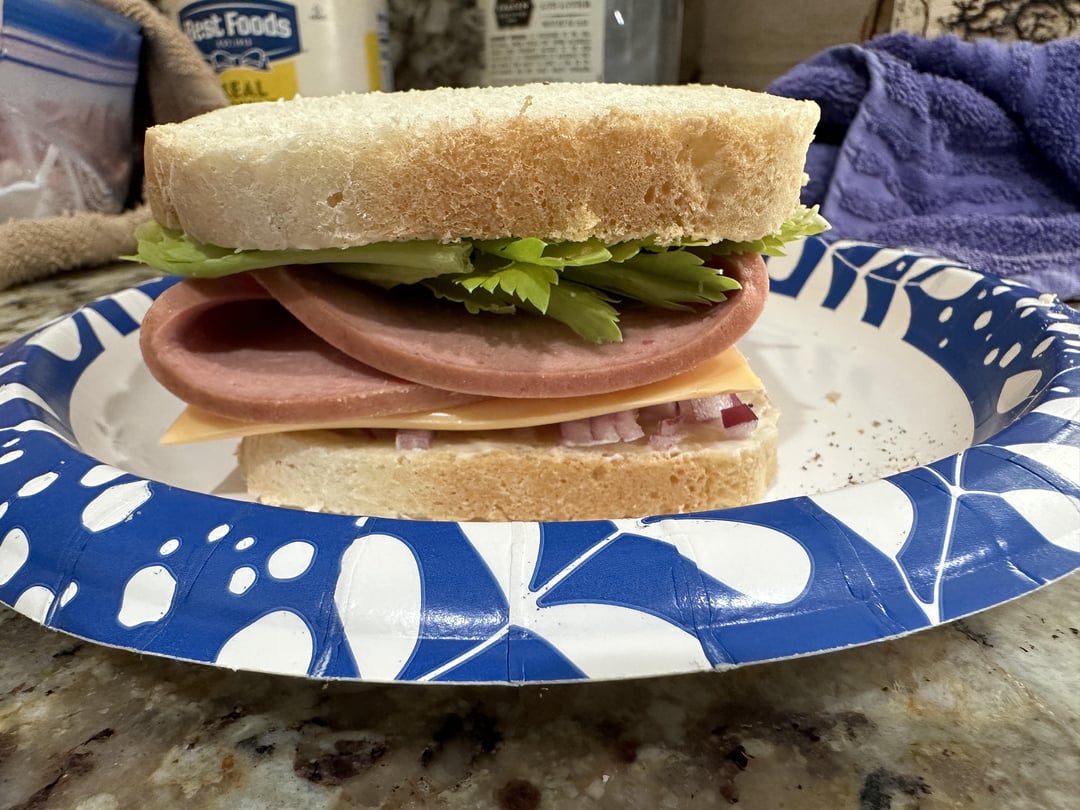 Beef bologna, kraft singles, red onion, celery leaves, mayo, & cracked black pepper on sourdough!by JensElectricWood Write A CommentYou must be logged in to post a comment.