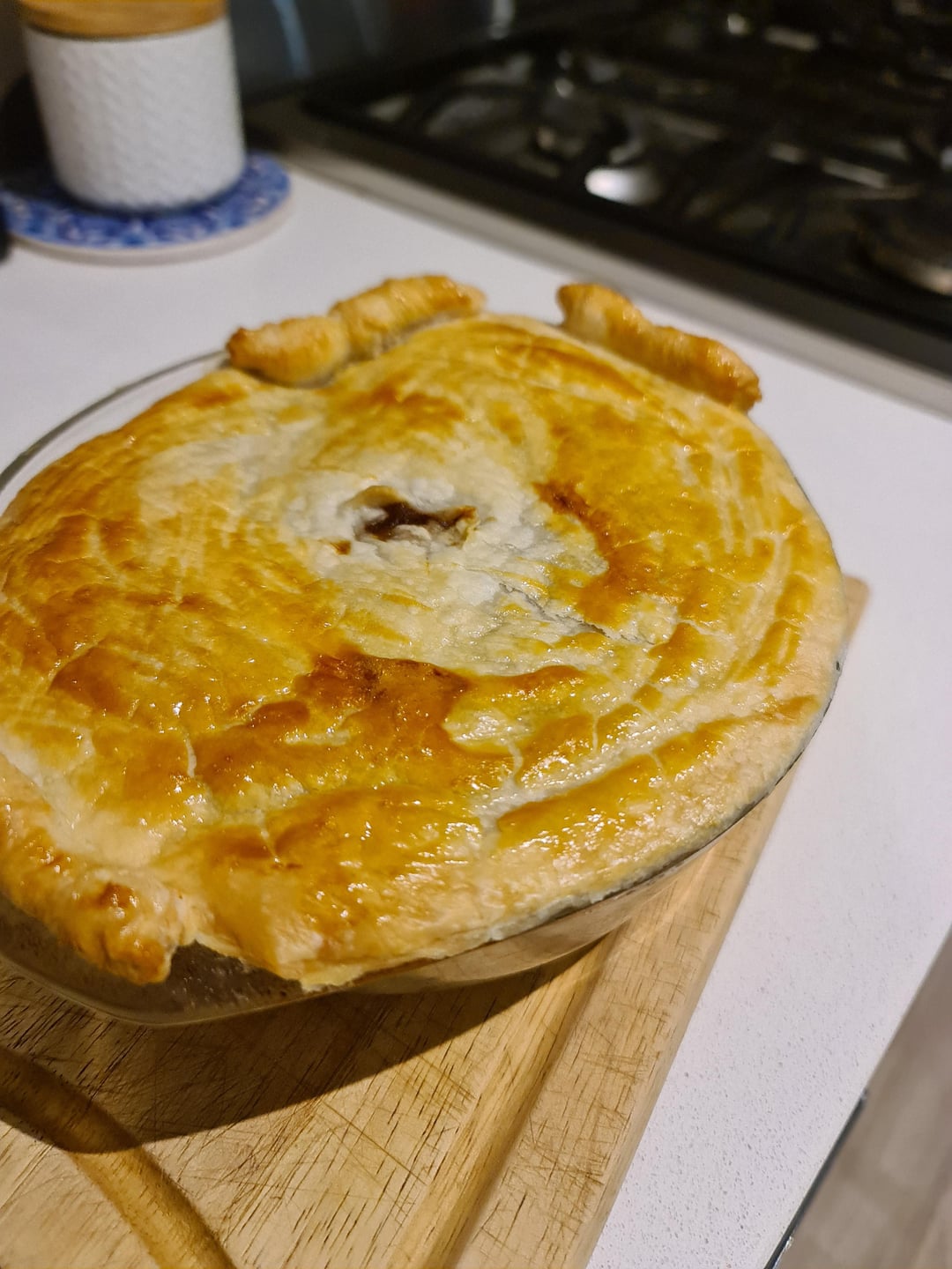I seared a side of rump steak (just under 1kg) with a little salt and pepper. Deglazed the crock pot with a splash of beer (coopers) then added a splash of oil and half a finely diced onion, sauteed. Added one small finely diced celery stick and carrot. Sauteed until soft. Returned the beef to the pot and topped with 700ml of beer, 2 beef stock cubes, a pinch of dried thyme and parsley. Brought to the boil then popped on the lid and placed in the oven at 140C for 4 hours. Checked on it at 2 hours and it didn’t need any more liquid. I used a store bought puff pastry sheet to line and pie dish and filled it with the shredded stew. Back in the oven at 180C for 45 minutes.