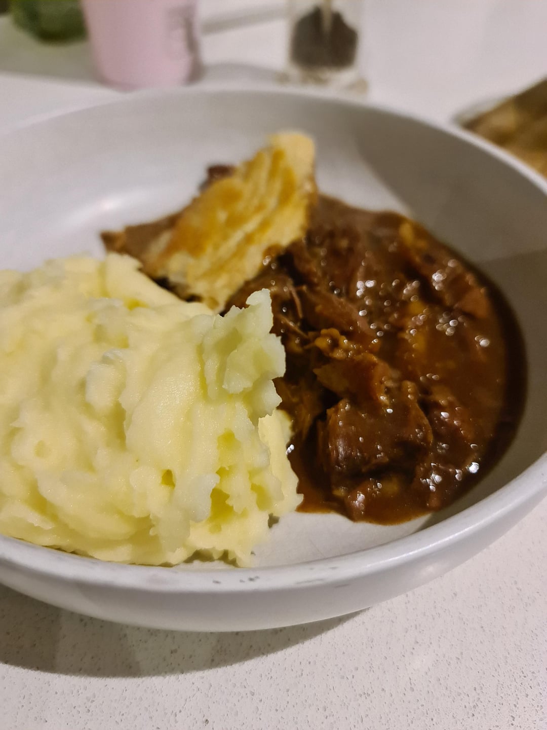 Low and slow in my crock pot for 4 hours before adding the pie crust and baking for another 45 minutes. Served with a very generous dollop of mash potato.