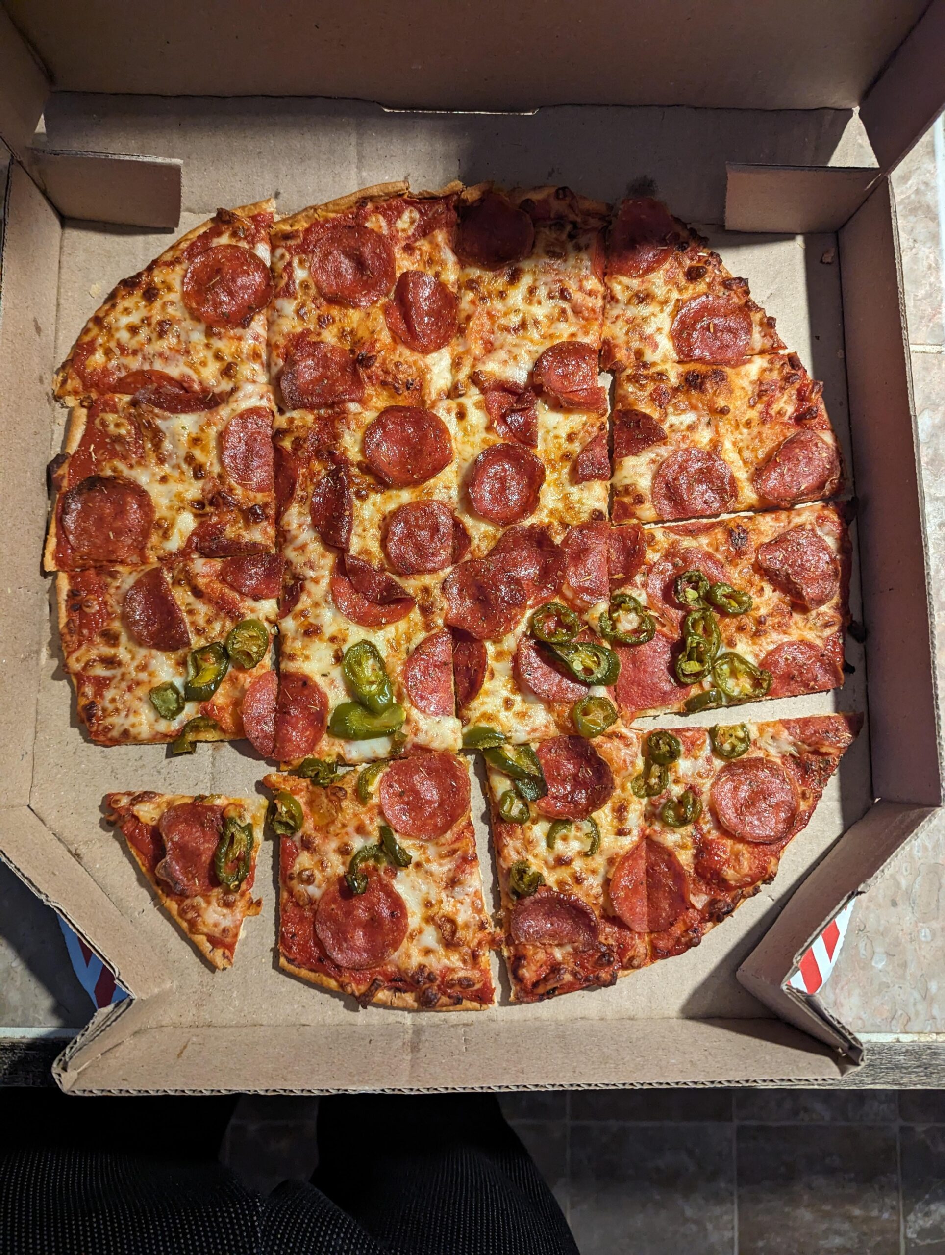16 slices is normal on a Medium or Large thin from Domino’s, the cuts line up, and the dough skin (the thins are pressed and premade, shipped to the store) actually fits perfectly into the right-sized box all the way to the edge, so no, no pieces were “taken” by the employees here for a snack. It even looks like they would line up just fine if you pressed them together more. Plus, a lot of the skins aren’t going to be perfectly round either. I’ve seen my fair share of oblong, warped, or otherwise crazy-looking thin crusts delivered to the stores I worked at. Compared to those, this pizza looks pretty normal