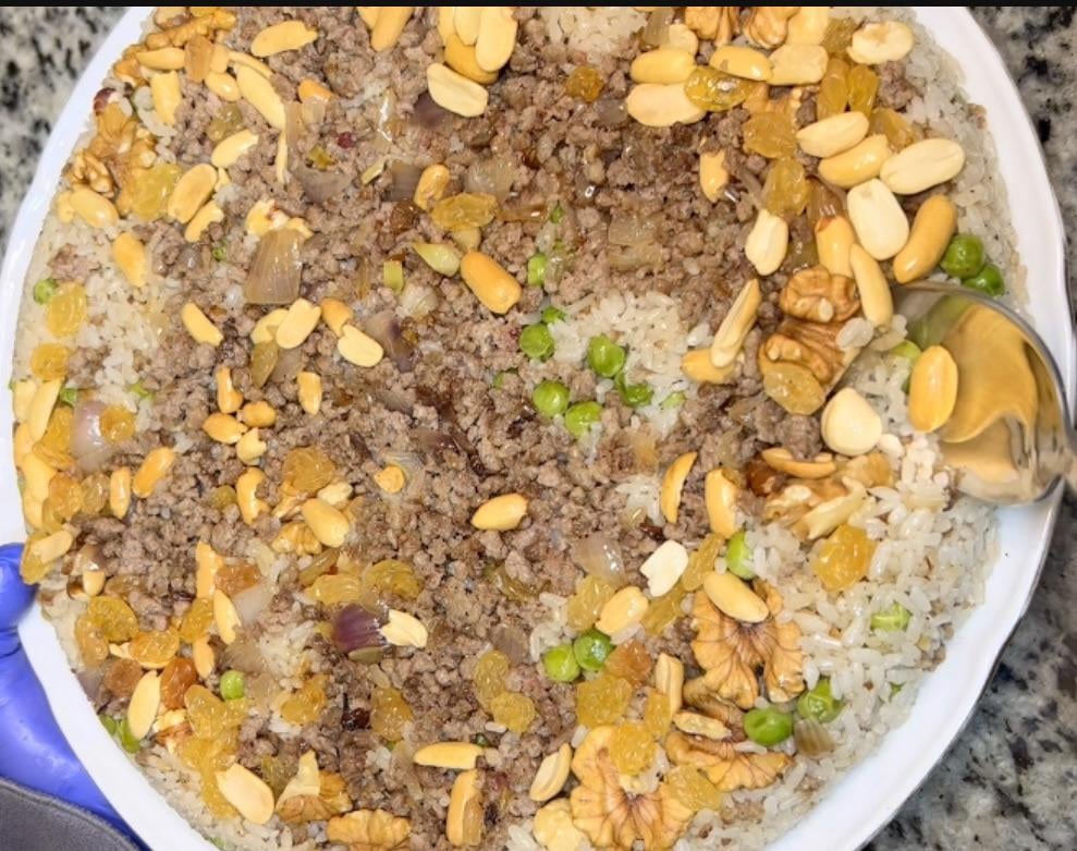 Instructions: In a pan put oil and butter till heat Add onions till golden Add minced meat till cooked Take half of meat in a dish and put it side Add peans to other half Add rice and stir Add boiling water just cover rice Cover rice till cooked Put rice in another dish Add the half quantity of minced meat which we put it side in a pan then add rice press rice well Upside down the pan in a big dish Serve it and enjoy 🥰
