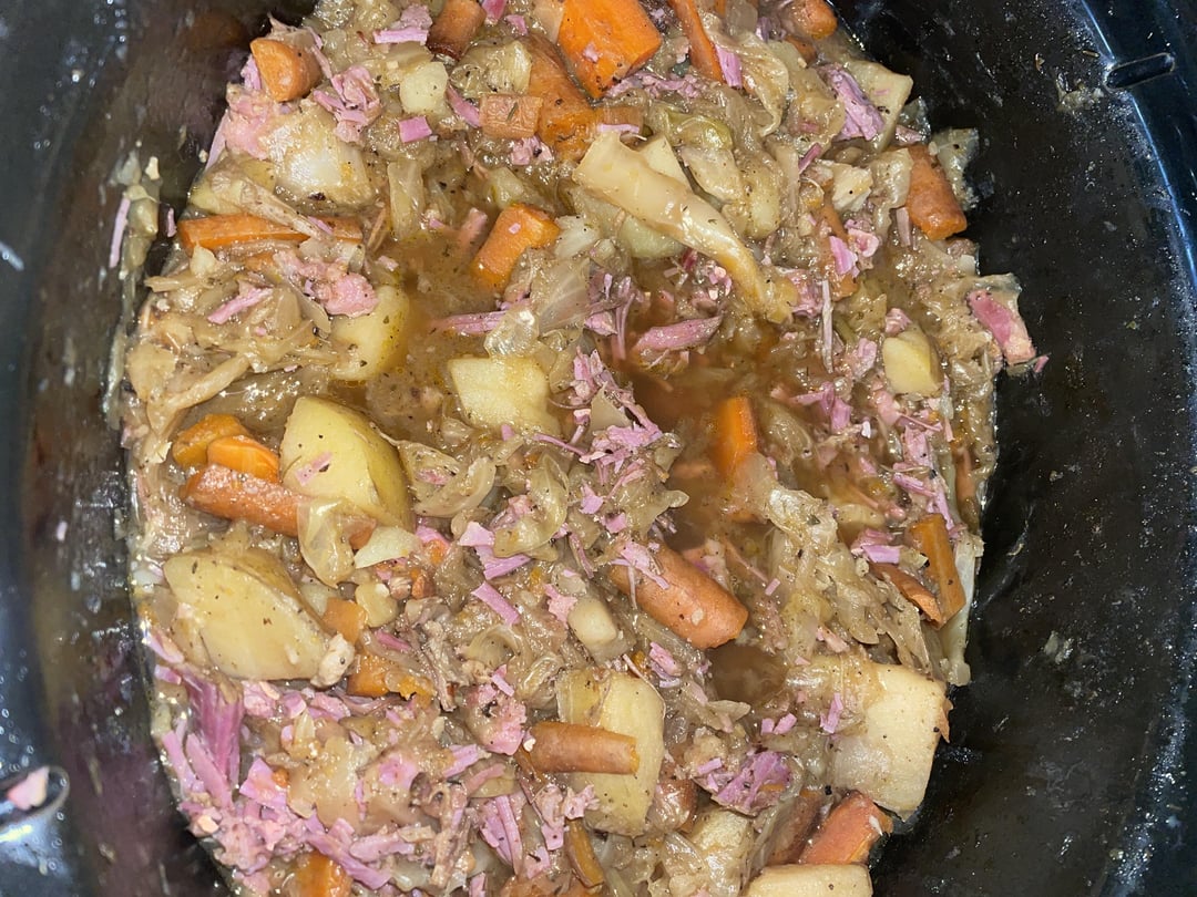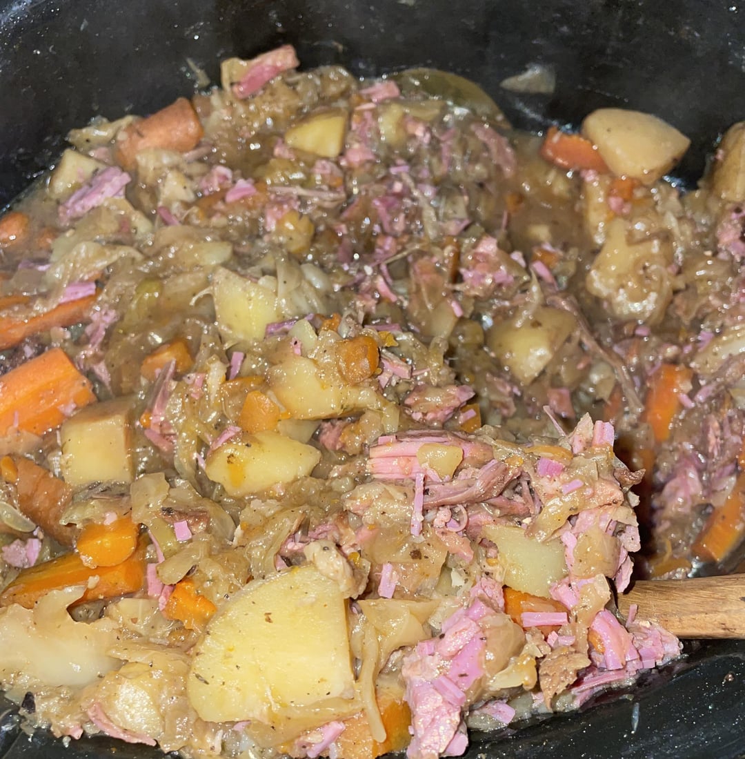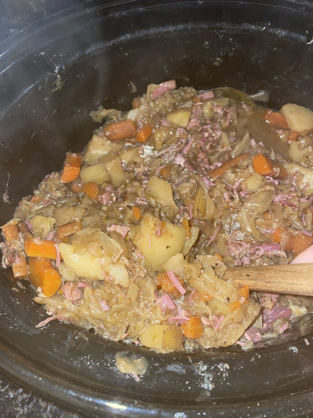Scooped the remaining roasted taters and carrots with those practically dissolved sweet onions, into the crock pot with the whole roast and cabbage. Let it go in low just a bit longer, then took the roast out and shredded before adding it back.