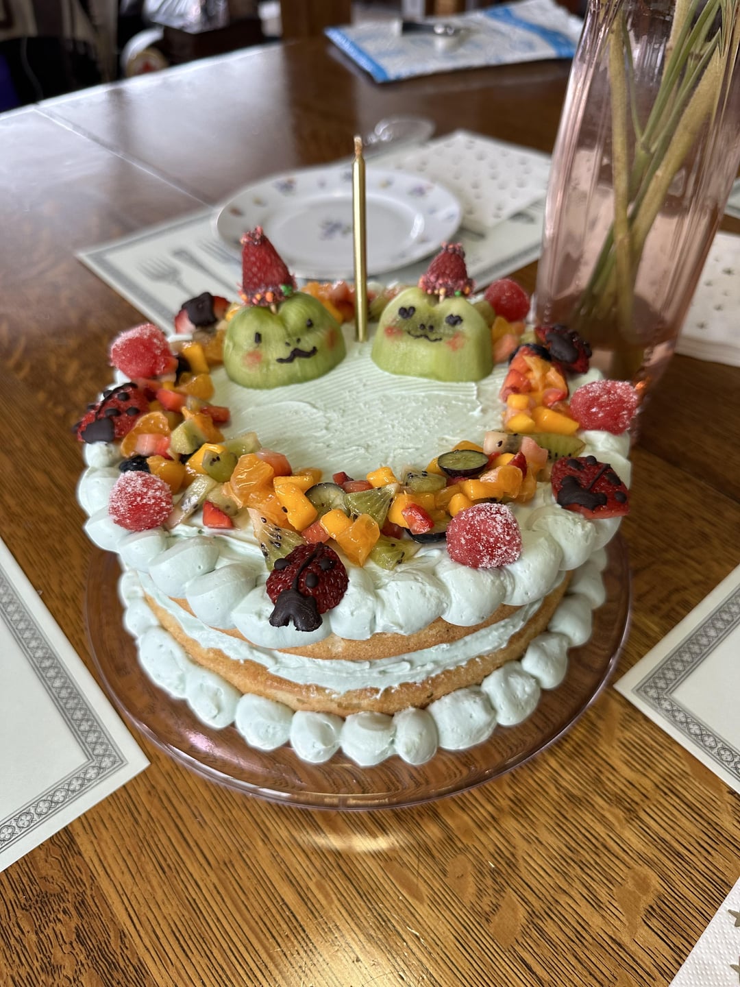 Kiwi frogs are GENIUS! And their little raspberry party hats!! I love fruits on cakes!