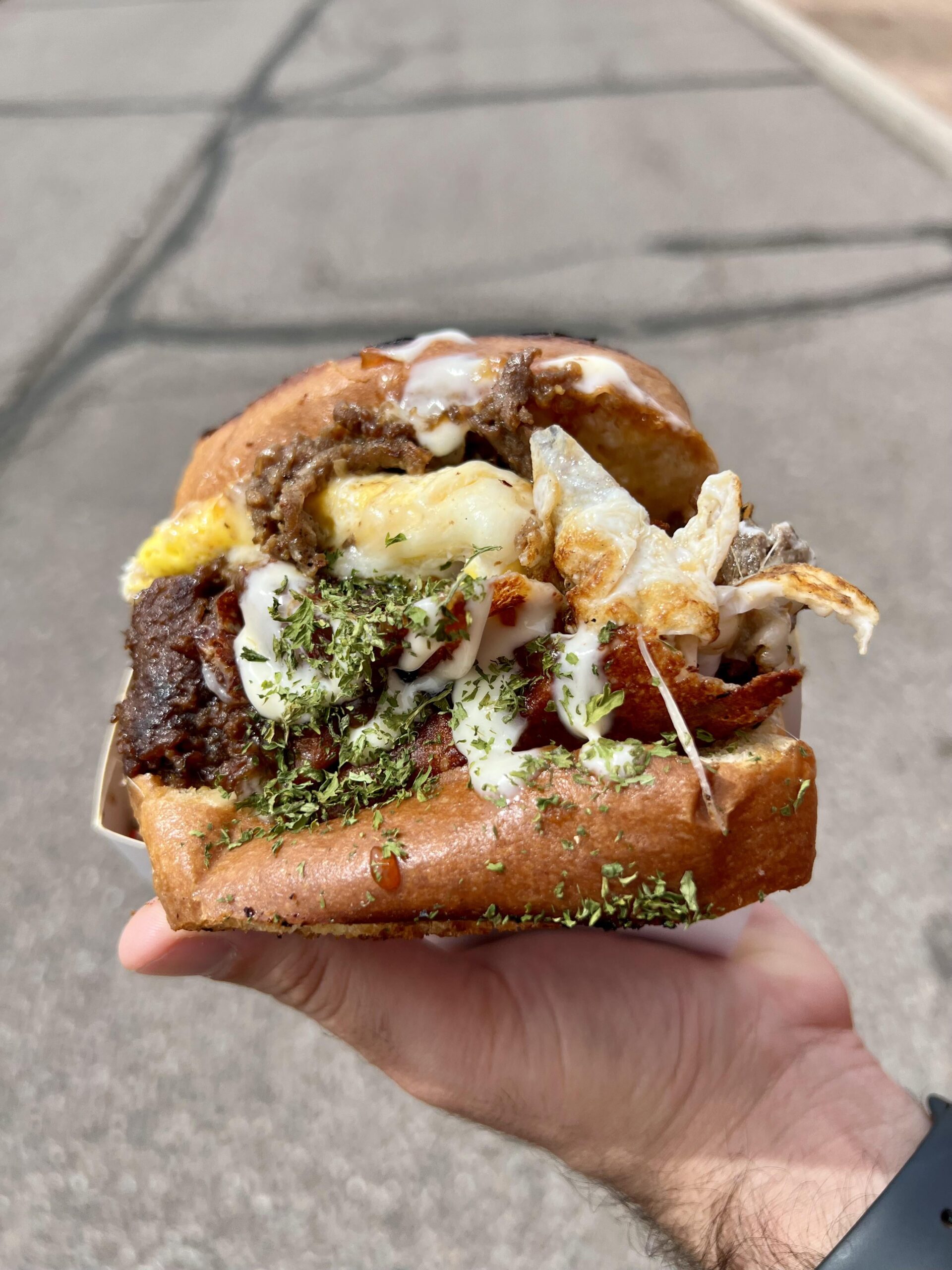 argus4ever 2 years ago Marinated Thin Sliced Ribeye Beef, Mozzarella Cheese, Fried Egg, Buttered Toast Milk Bread, Teriyaki Sauce, Sweet MayoIn Phoenix at a farmer’s market