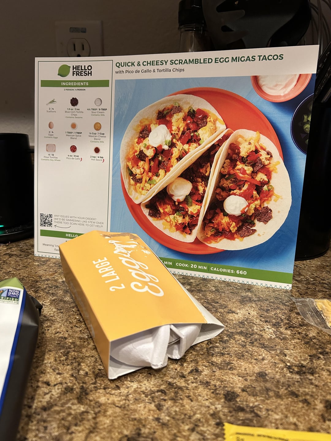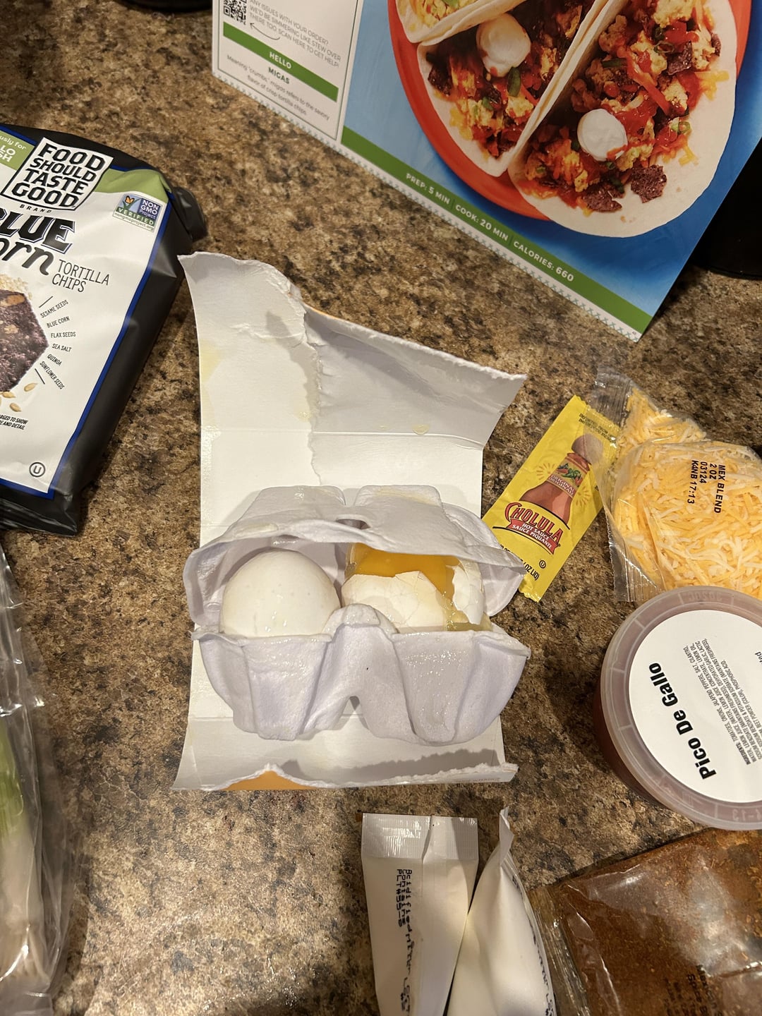 This was just delivered 10 minutes ago (7 hours later than usual). Also, only 2 eggs to make 6 tacos??