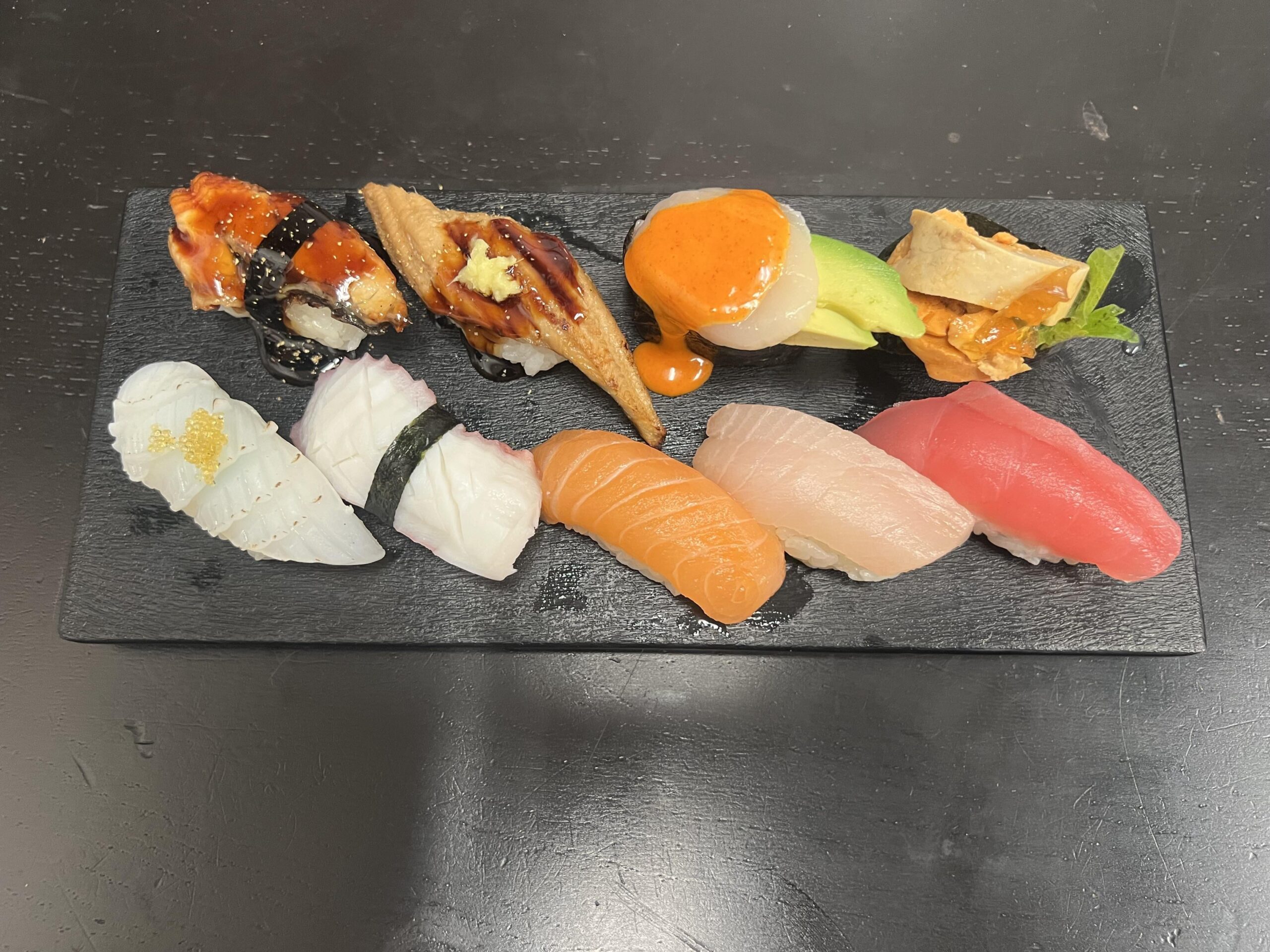 Top left to bottom right: unagi (fresh water eel), anago (salt water eel), spicy scallop, ankimo (monkfish liver pate), ika (squid), tako (octopus), sake (salmon), hamachi (yellowtail), maguro (yellowfin).by anarcho-urbanist Write A CommentYou must be logged in to post a comment.