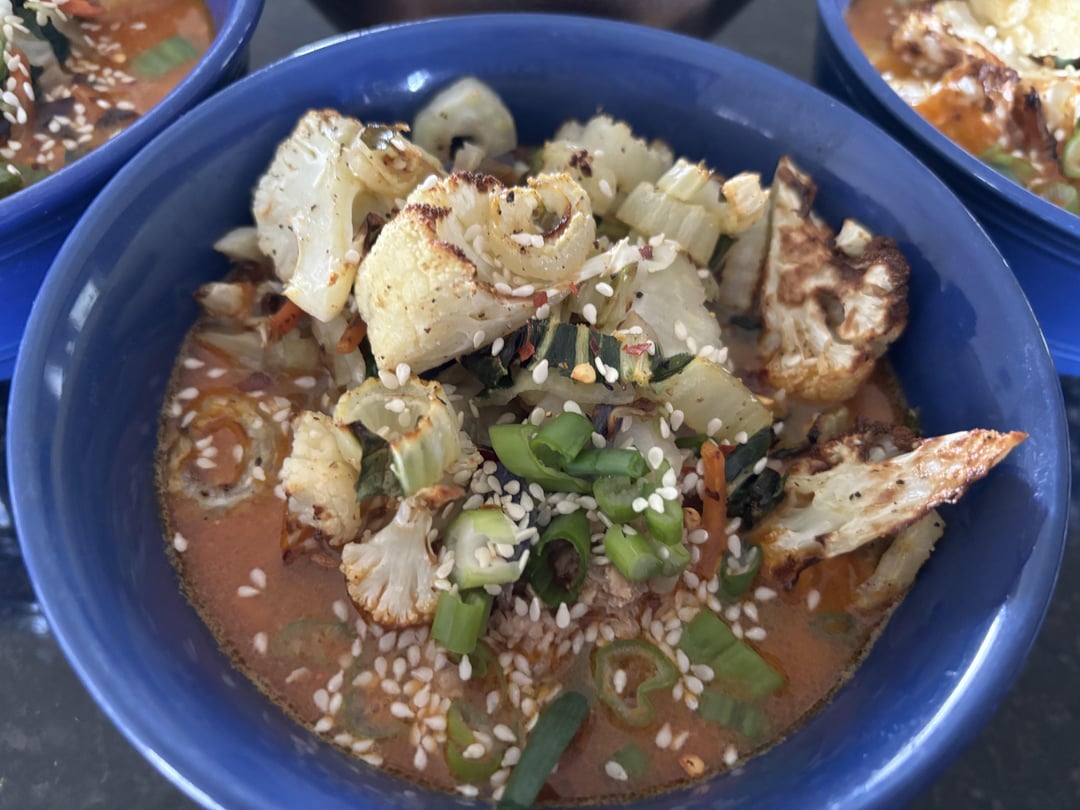 This was pretty solid. I like spice so I added sriracha on top of the red pepper flake. I also added some roasted cauliflower and charred some bok choy with the cabbage mix to bulk out the meal. Based on previous posts I cooked the noodles for 1 min before rinsing and let the hot broth take care of the rest.