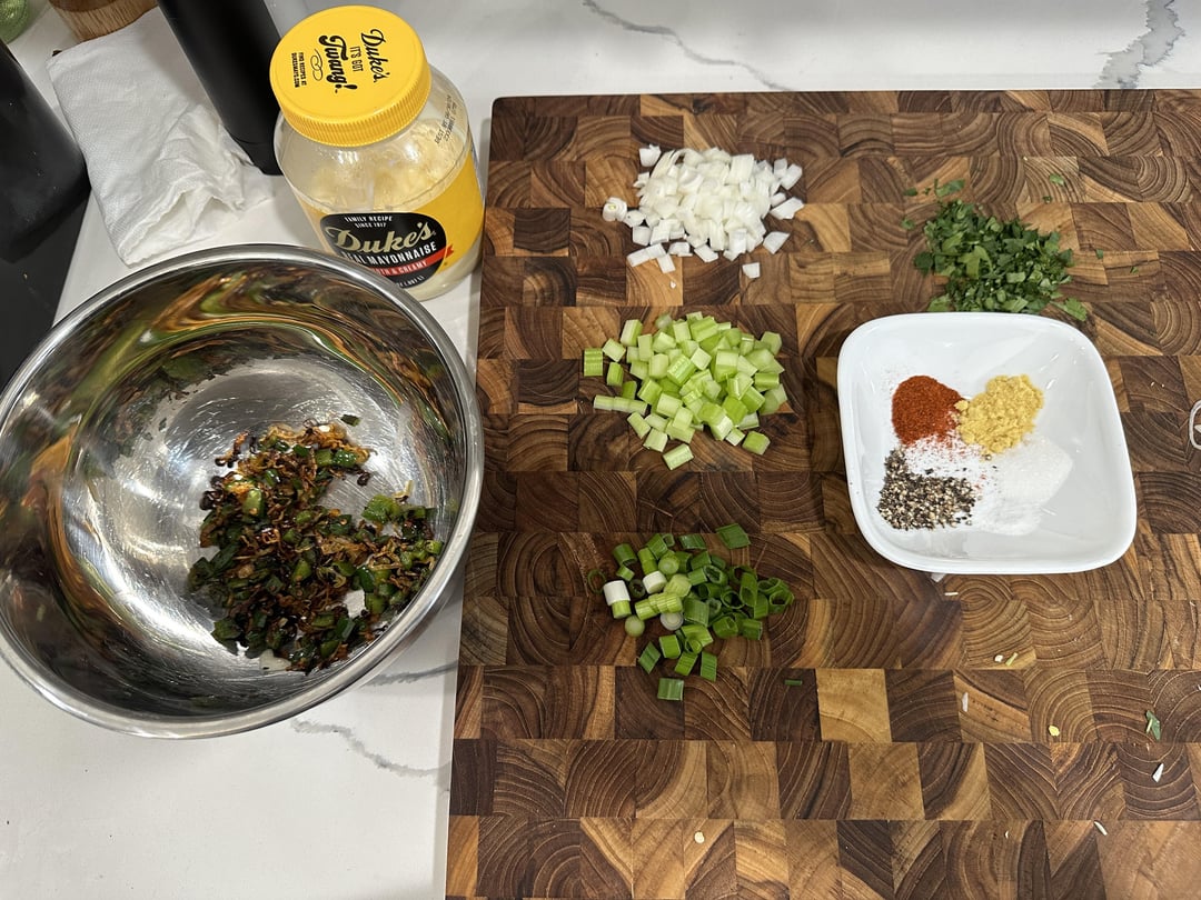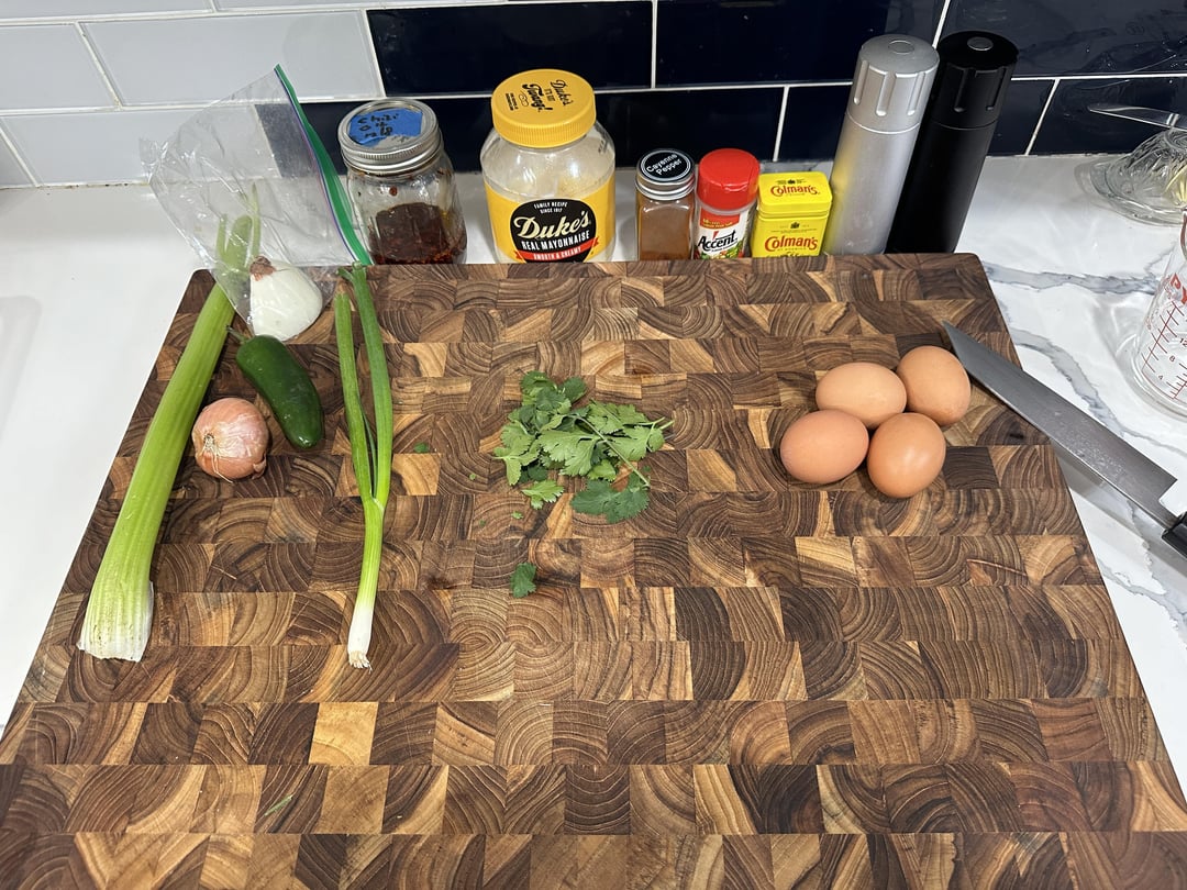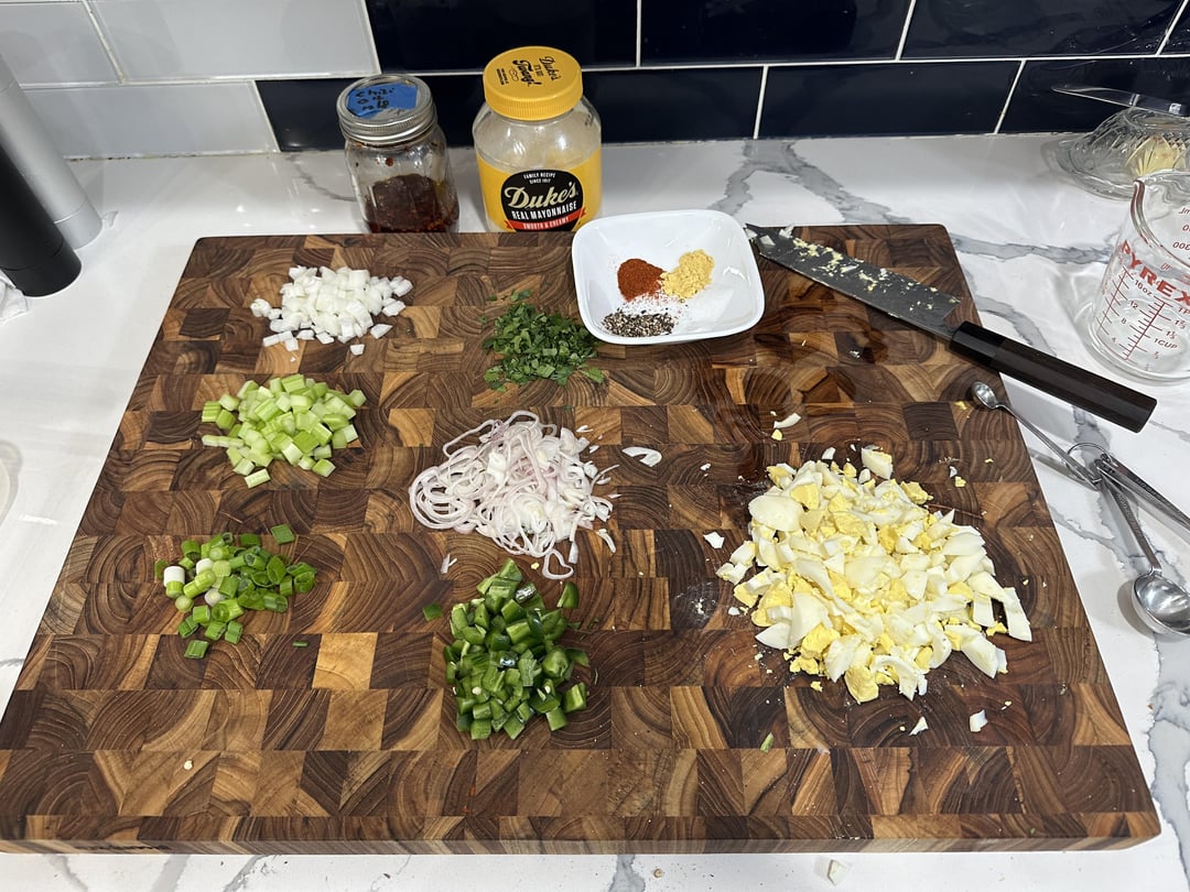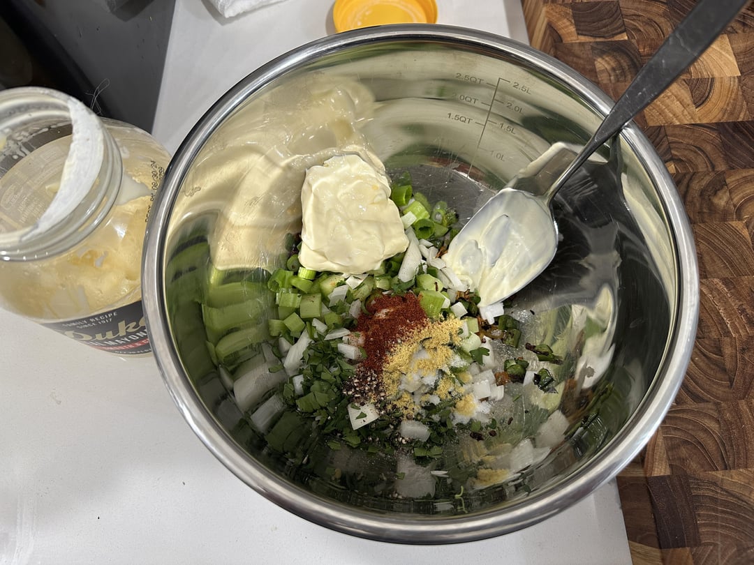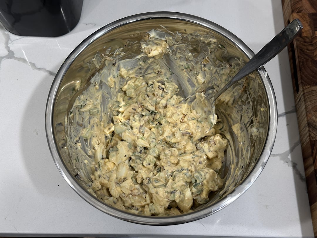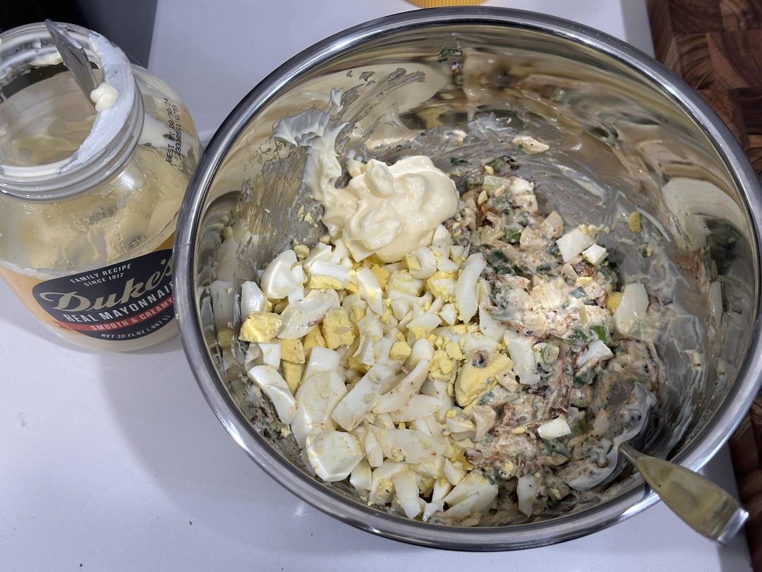 needs djion, chopped cornichon and maybe one more egg to cut down on the mayo