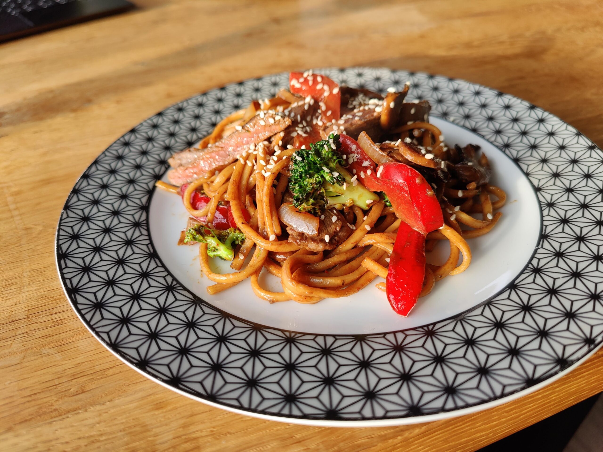 Beef first cooked in butter until outside was browned. Then removed beef and put in bell pepper, onion and mushroom until soft and brown. Then added brocolli and cooked for 4 minutes. Added in the noodles, slices of beef and finally stirred in the sauce.
