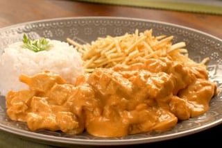 It sounds weird, but it's very delicious. In Brazil we eat stroganoff with this small crunchy potatoes we call "batata palha". I don't think these potatoes are popular outside Brazil (i didn't see it in supermarket of any country I've been lol)