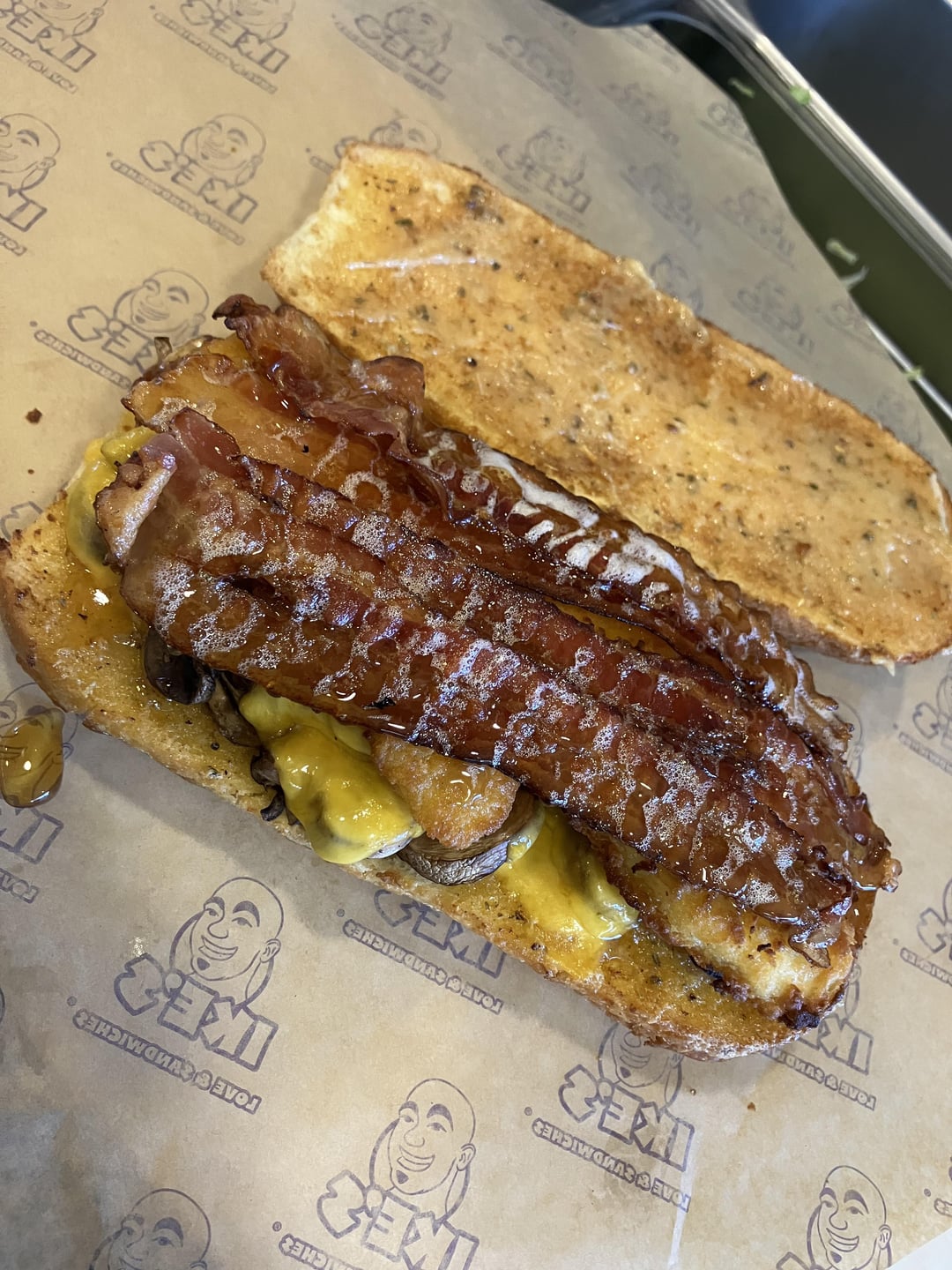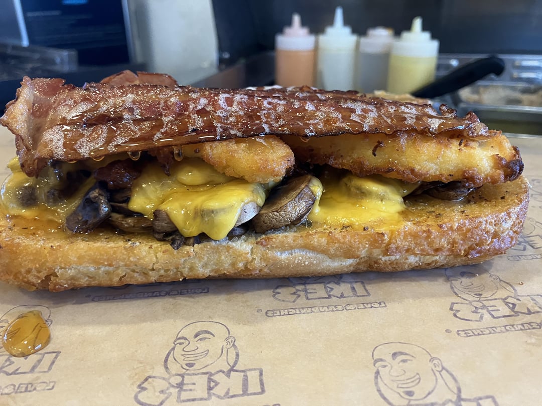 Mushrooms, red pesto, cheddar, chicken tenders, bacon, honey, “Dirty Sauce”, Dutch Crunch. The title is the feeling in my heart, not the name of the sandwich