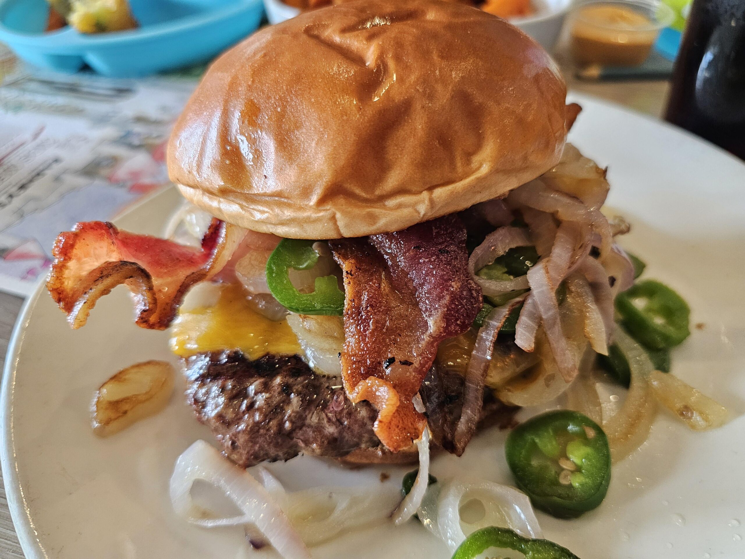 Bacon, cheddar cheese, sautéed jalapeños & sautéed onions