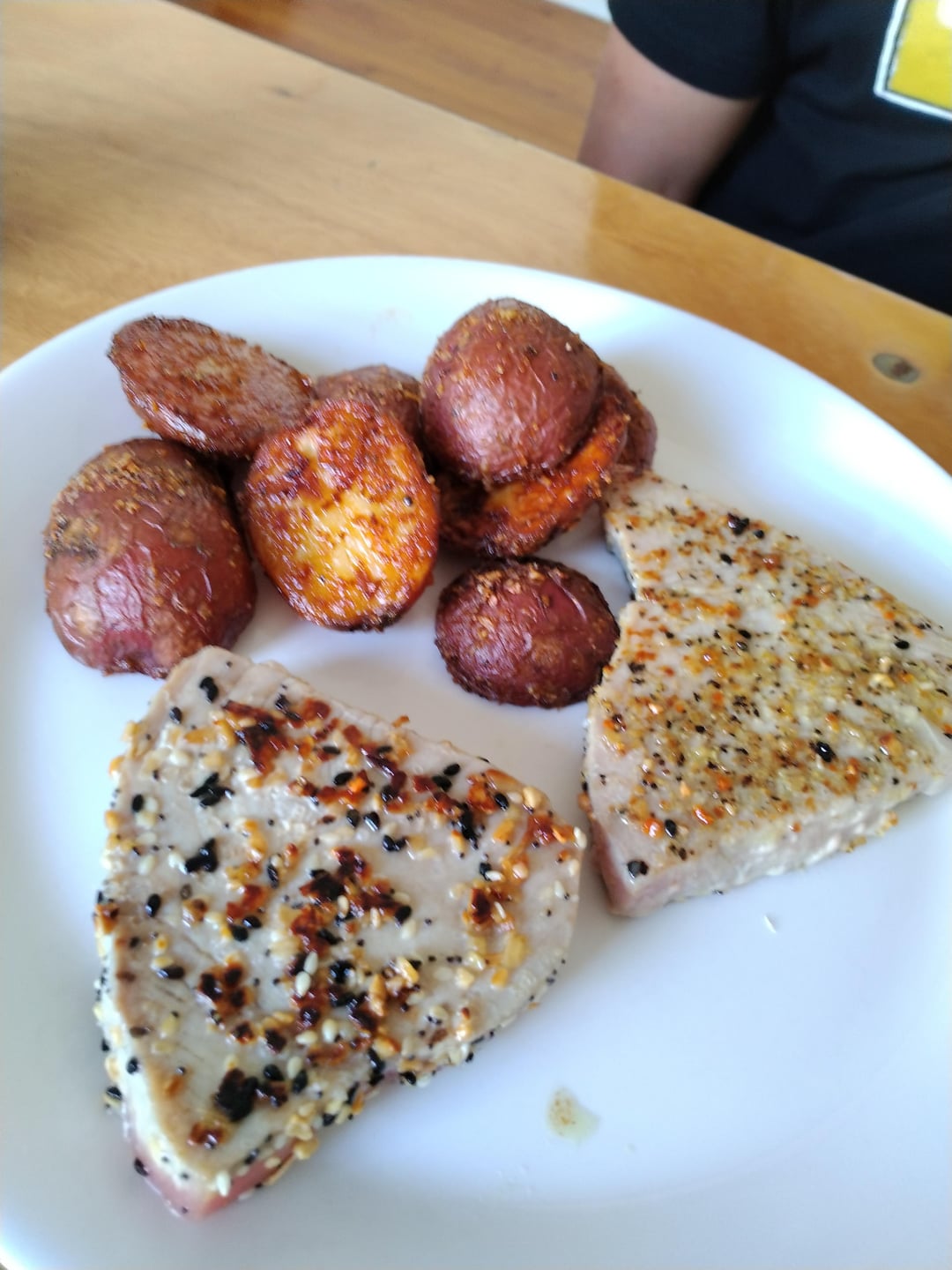 Tuna steak one had everything but the bagel seasoning & the other had lemon pepper. Cooked 1 min on each side. 1st time cooking them should have done 30 sec per side.