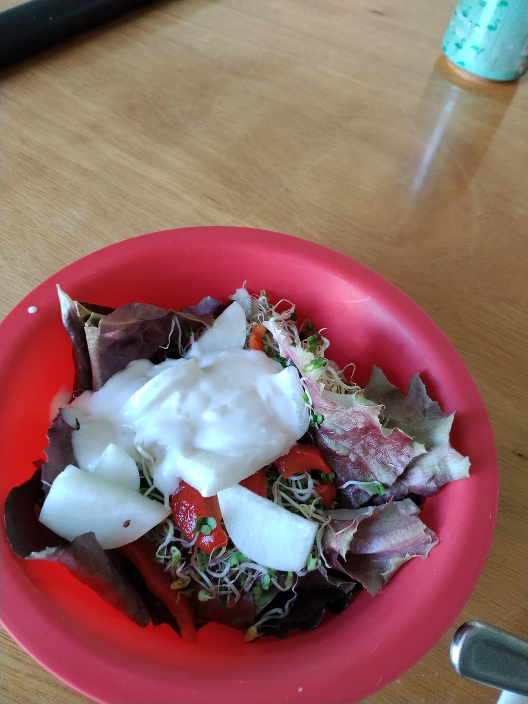 Salad had red leaf lettuce(don't know name) broccoli & alfalfa sprouts mix, baby white turnips, roasted red peppers with blue cheese dressing.