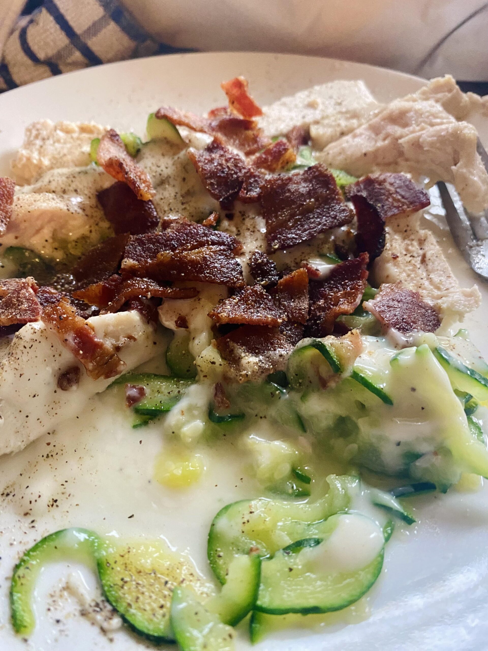 5. Add zucchini noodles and chopped chicken to plate. Pour over heated Alfredo sauce of your choice. Add chopped bacon on top.