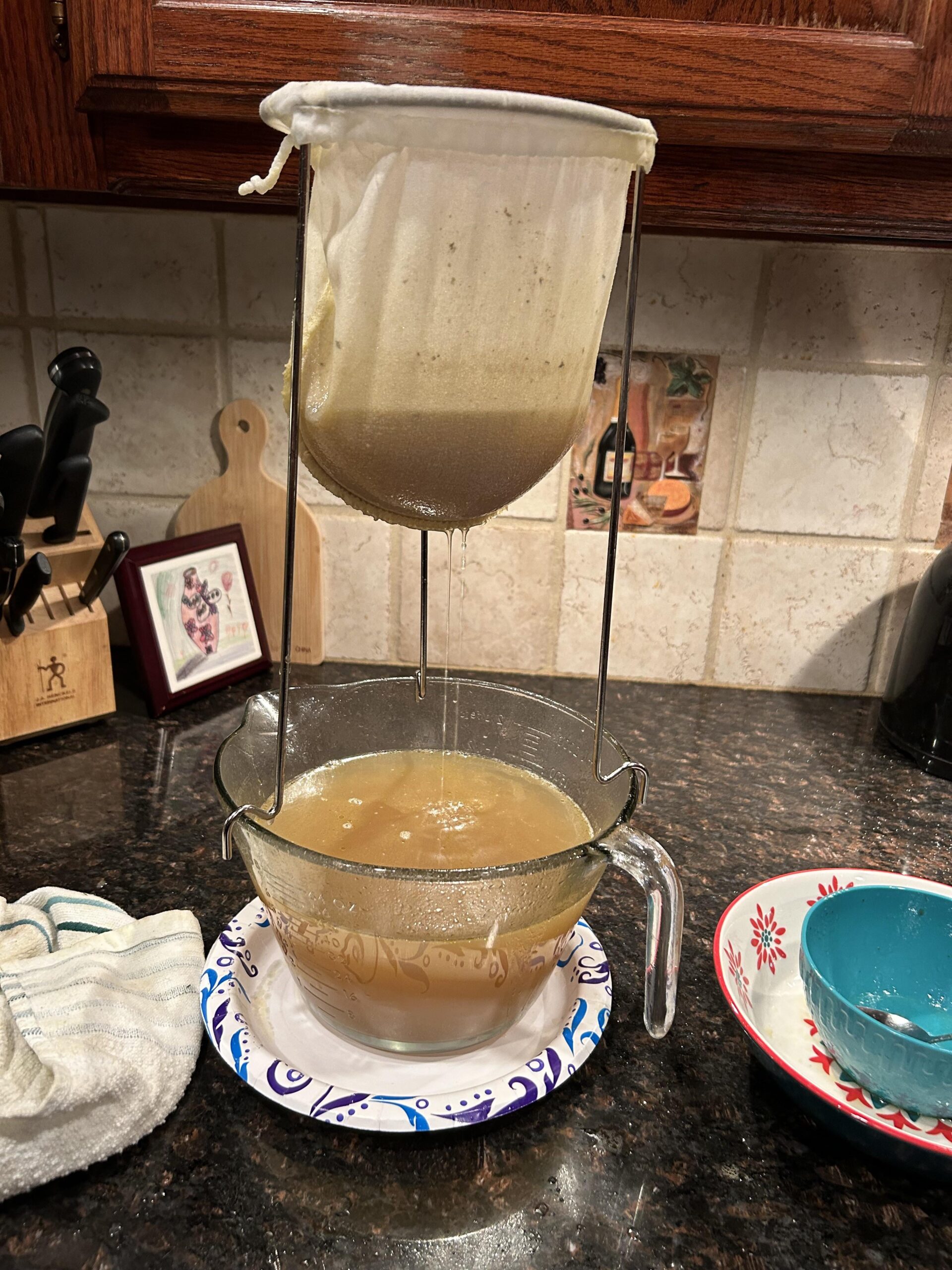•I would decrease the amount of water or increase the chicken bones. That’s 9 quarts for 4 carcasses, which seems like not the best ratio to me.