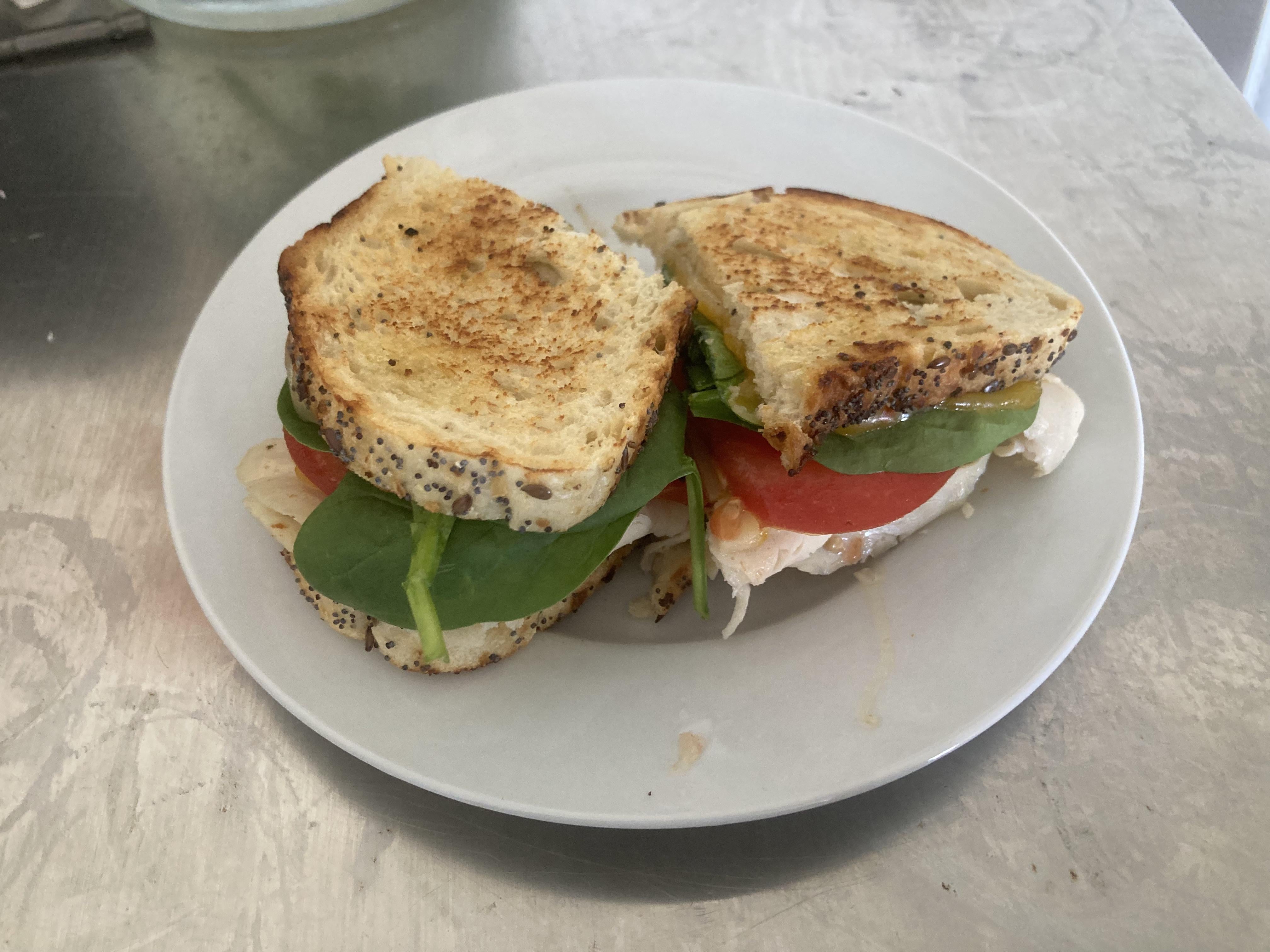 Toasted sourdough bread, garlic herb chicken, melted pepper Jack and cheddar cheese, and fresh spinach & tomato!!